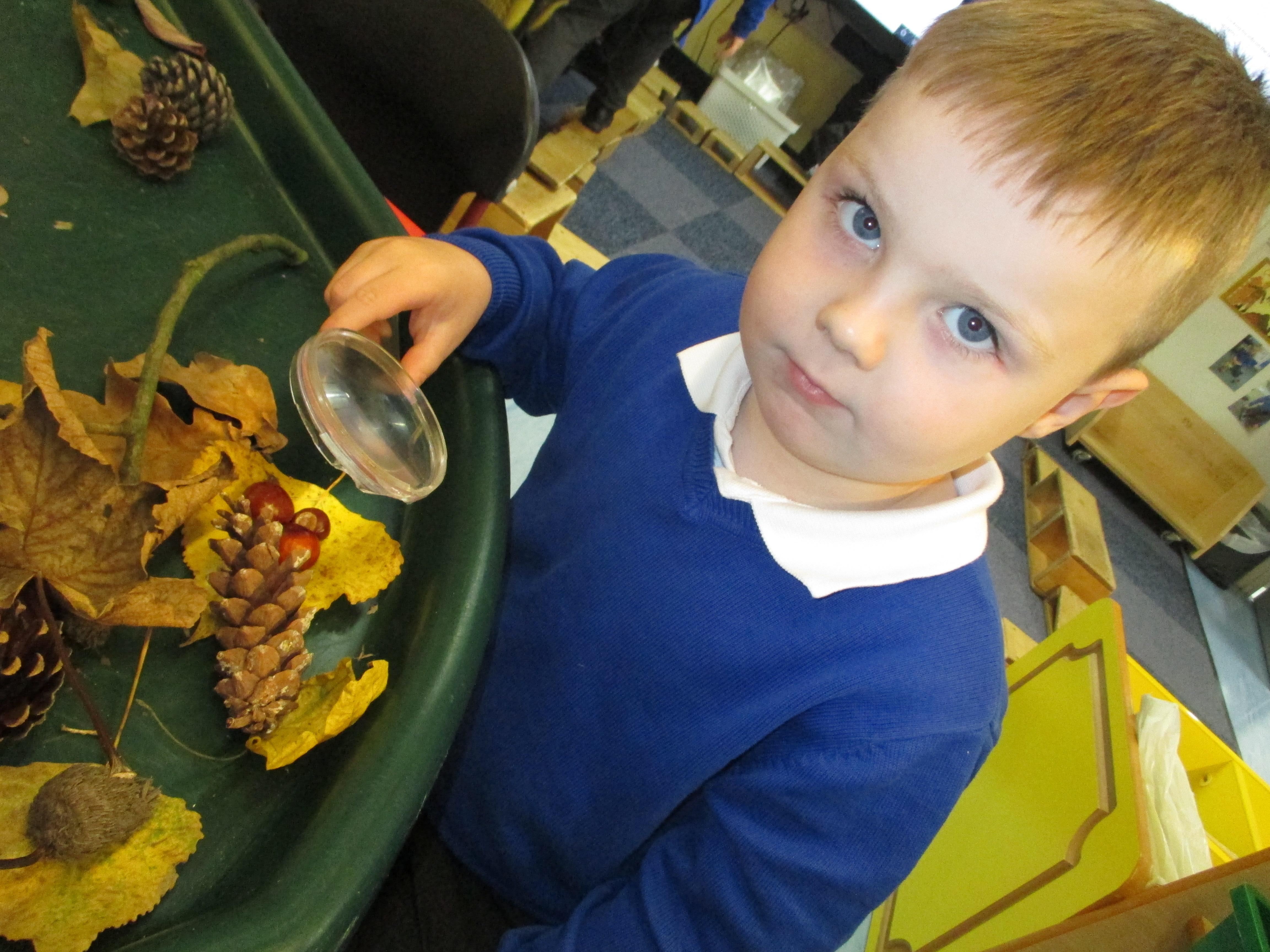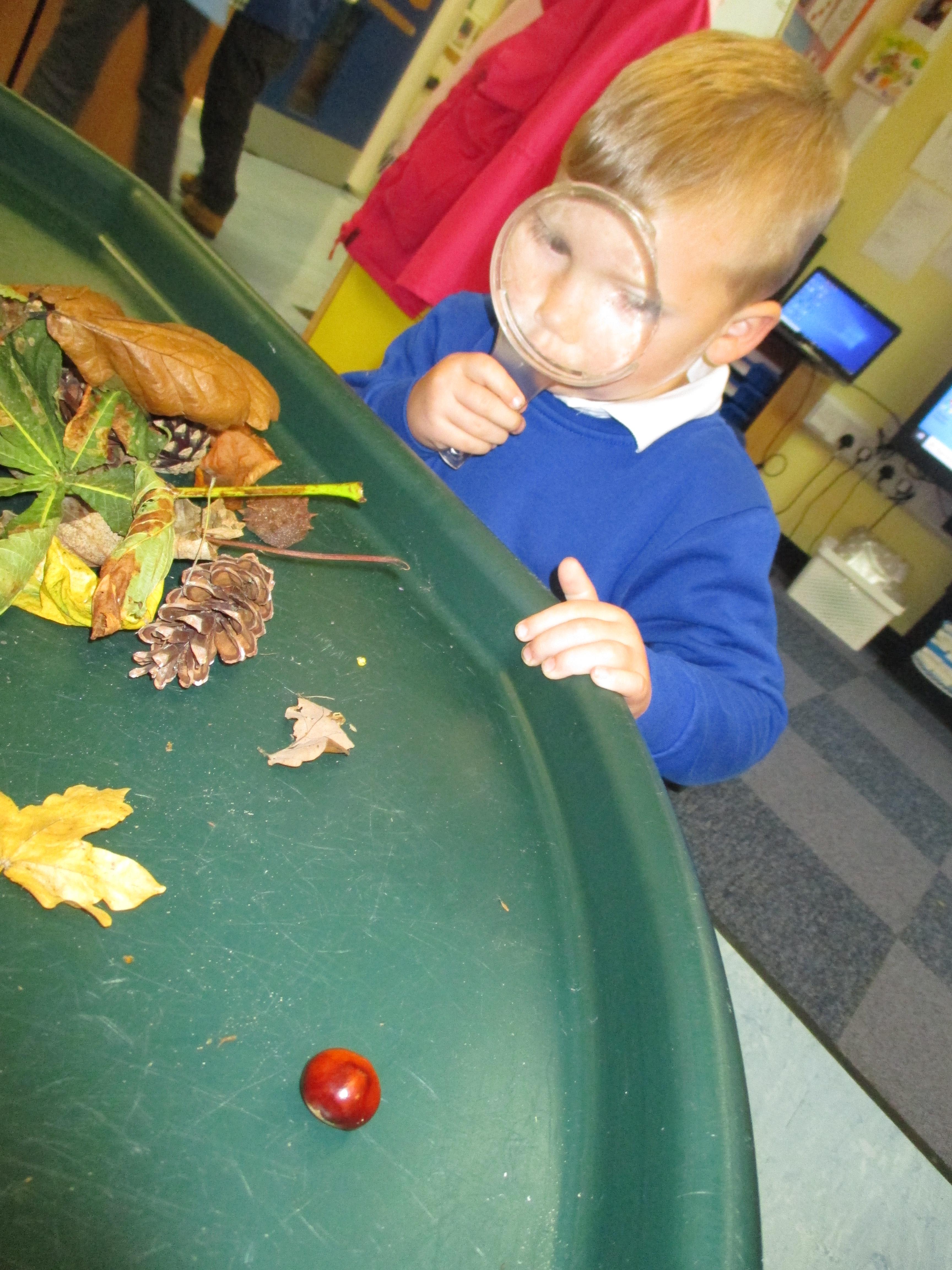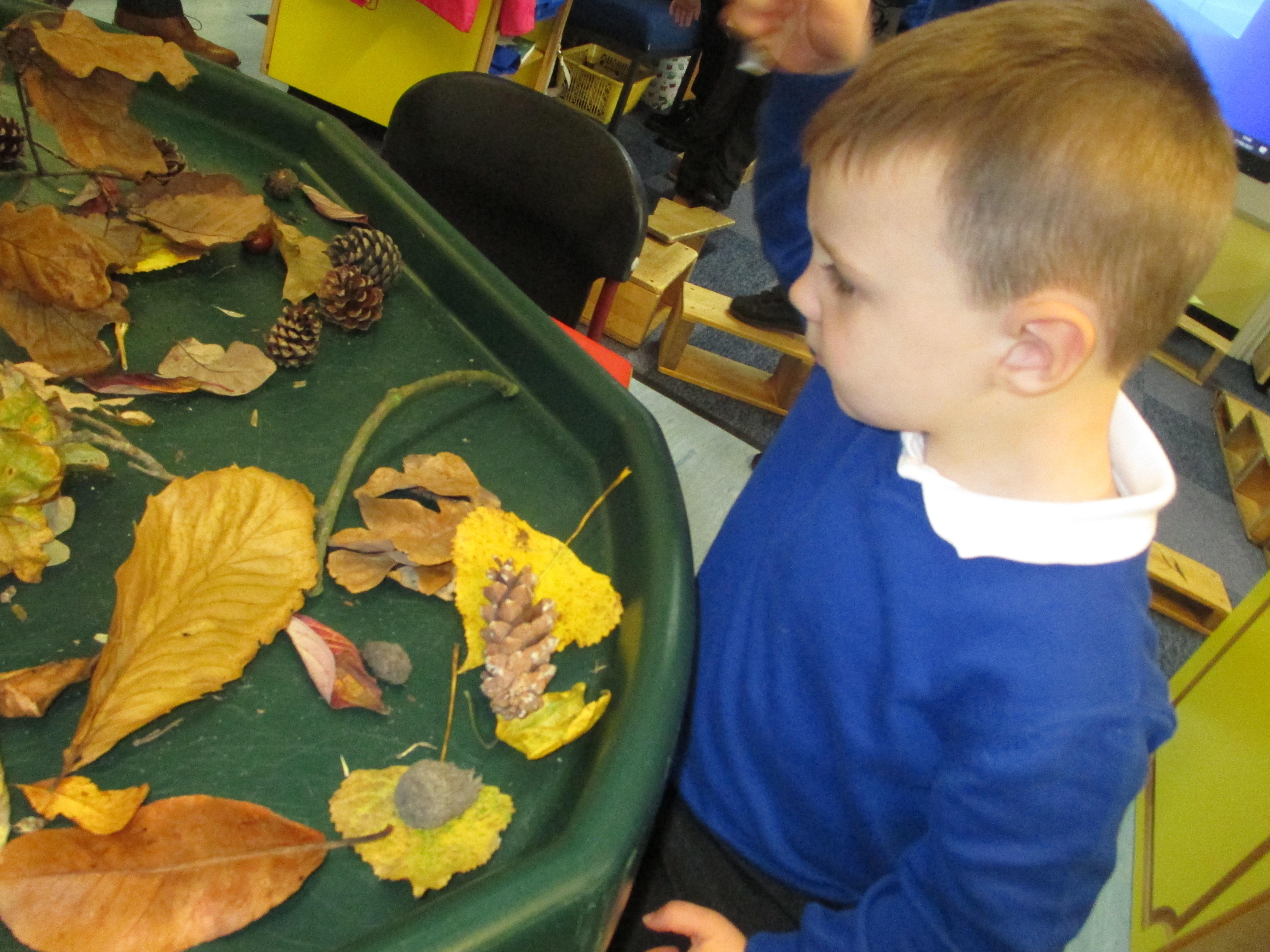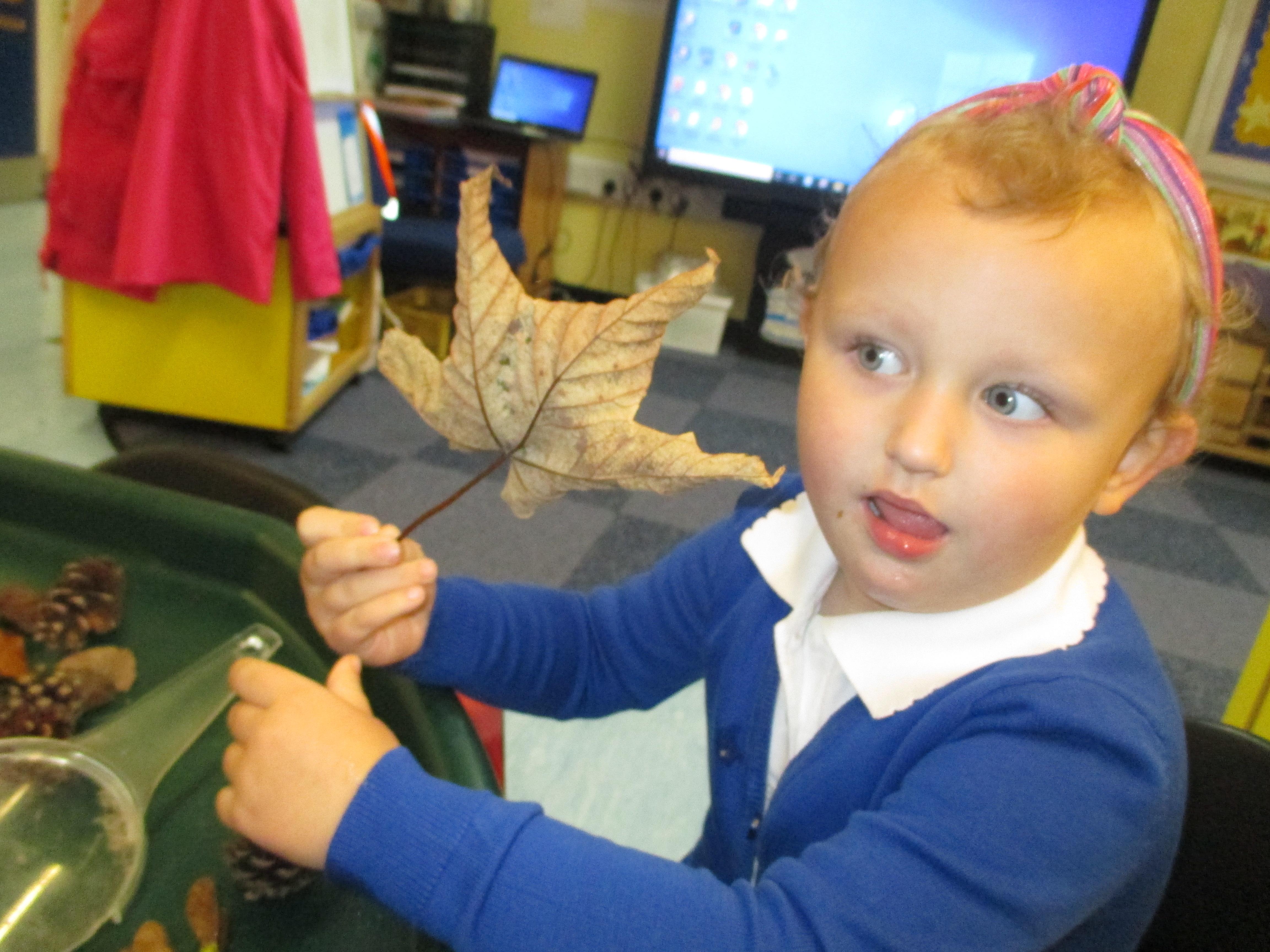 We have been talking about the season of 'Autumn'. We exploring different objects that we can find in Autumn such as pine cones, conkers, conker shells and coloured leaves. We have been exploring how they feel and have been thinking of our own describing words.