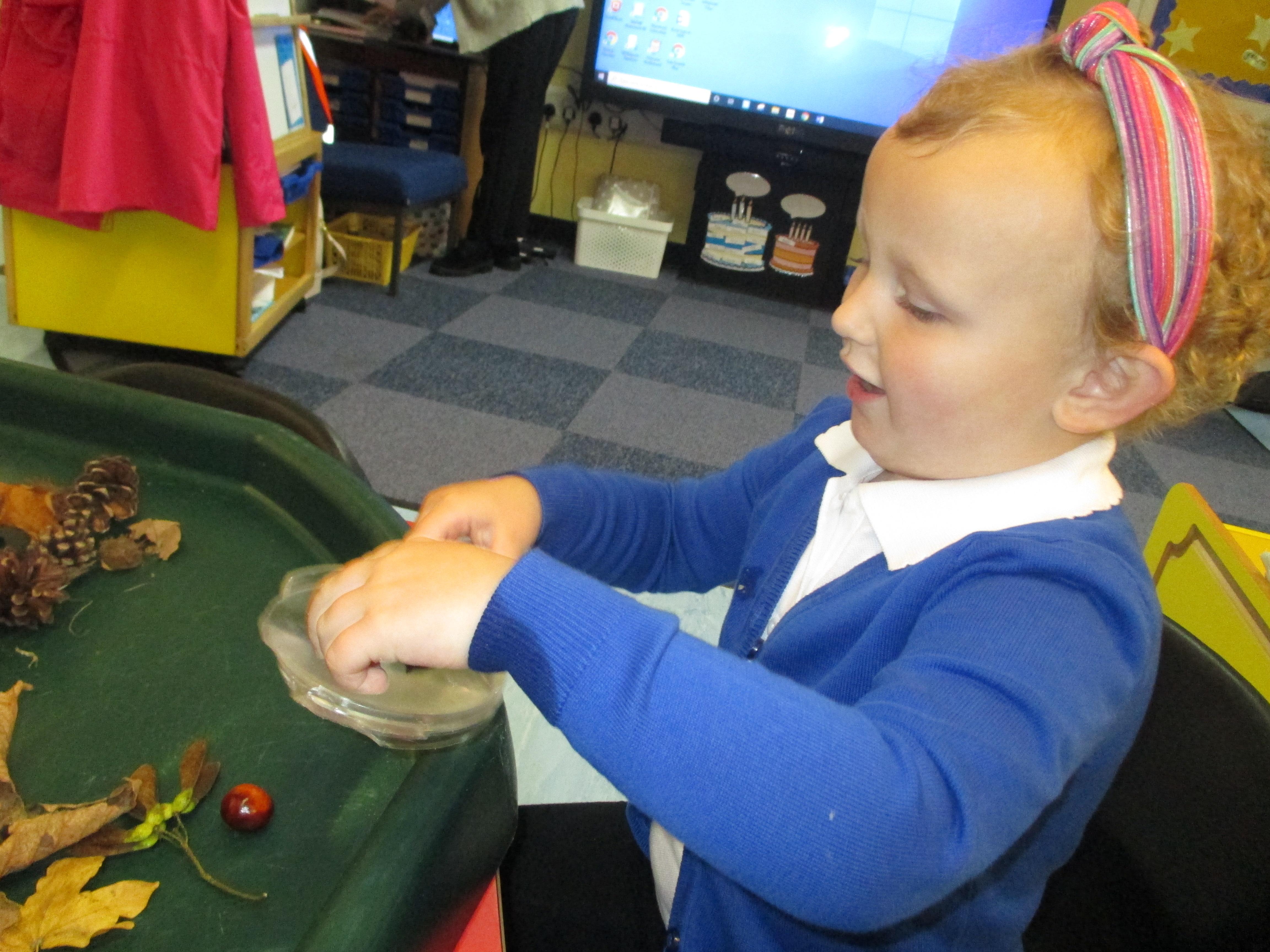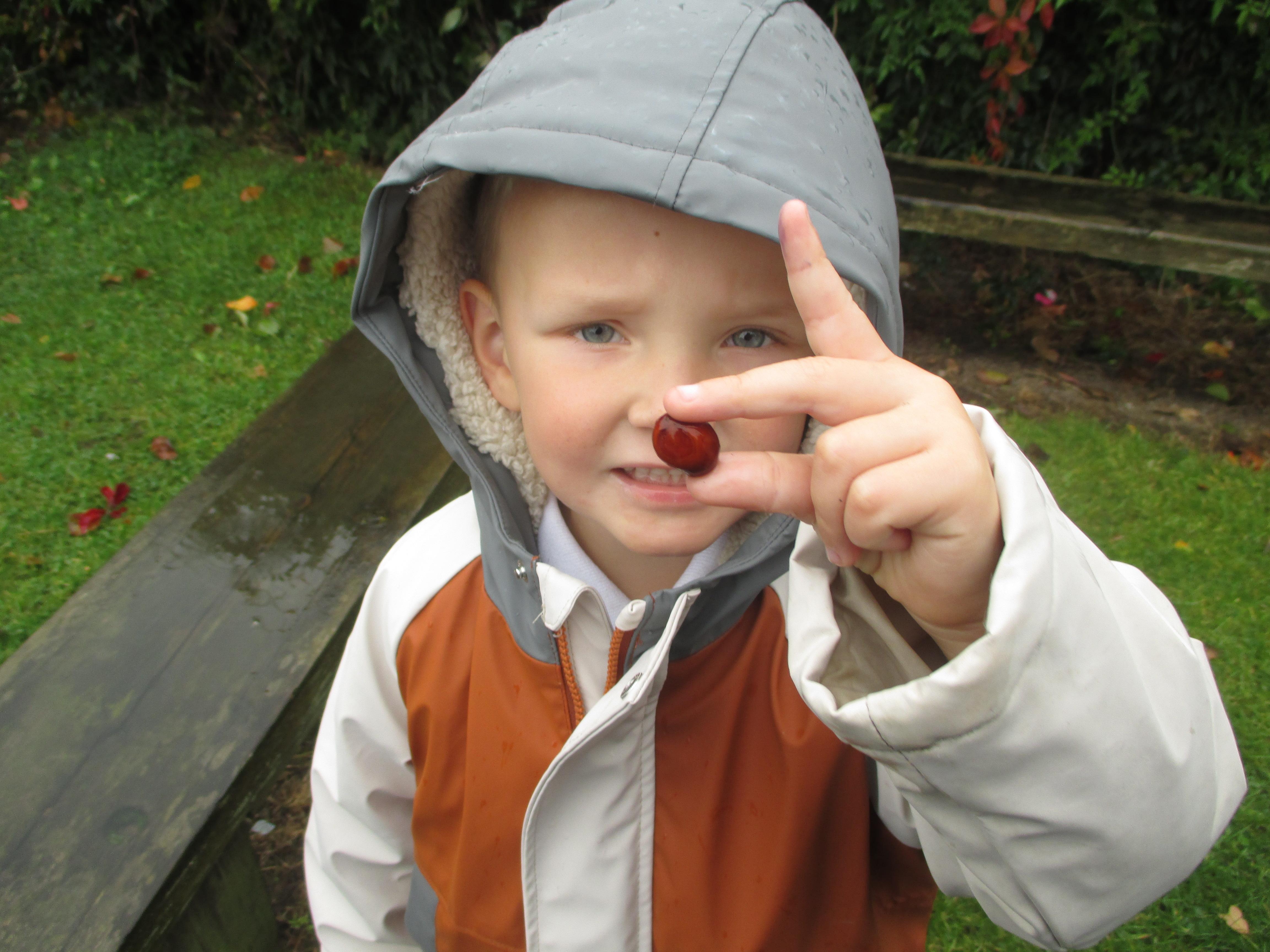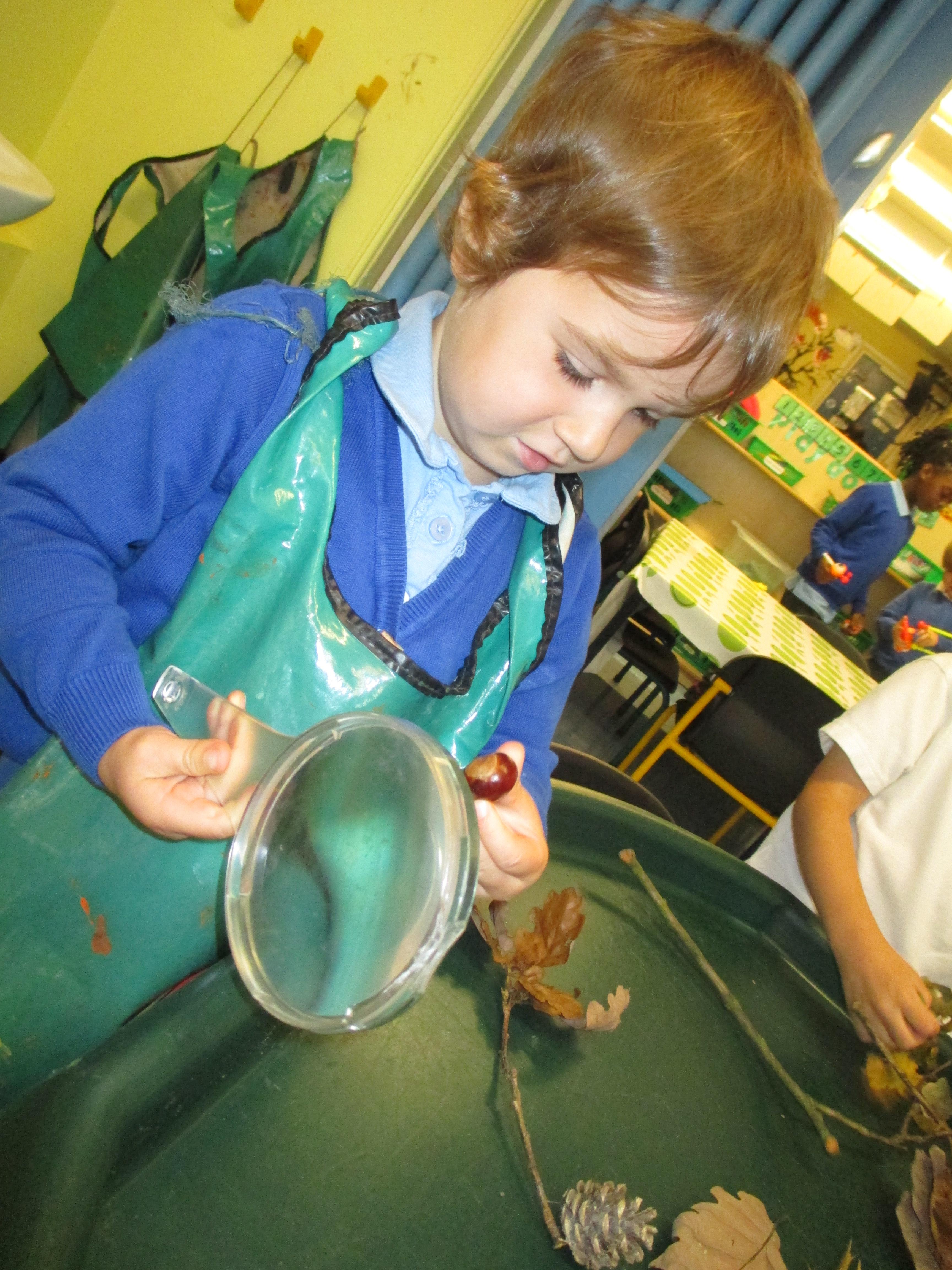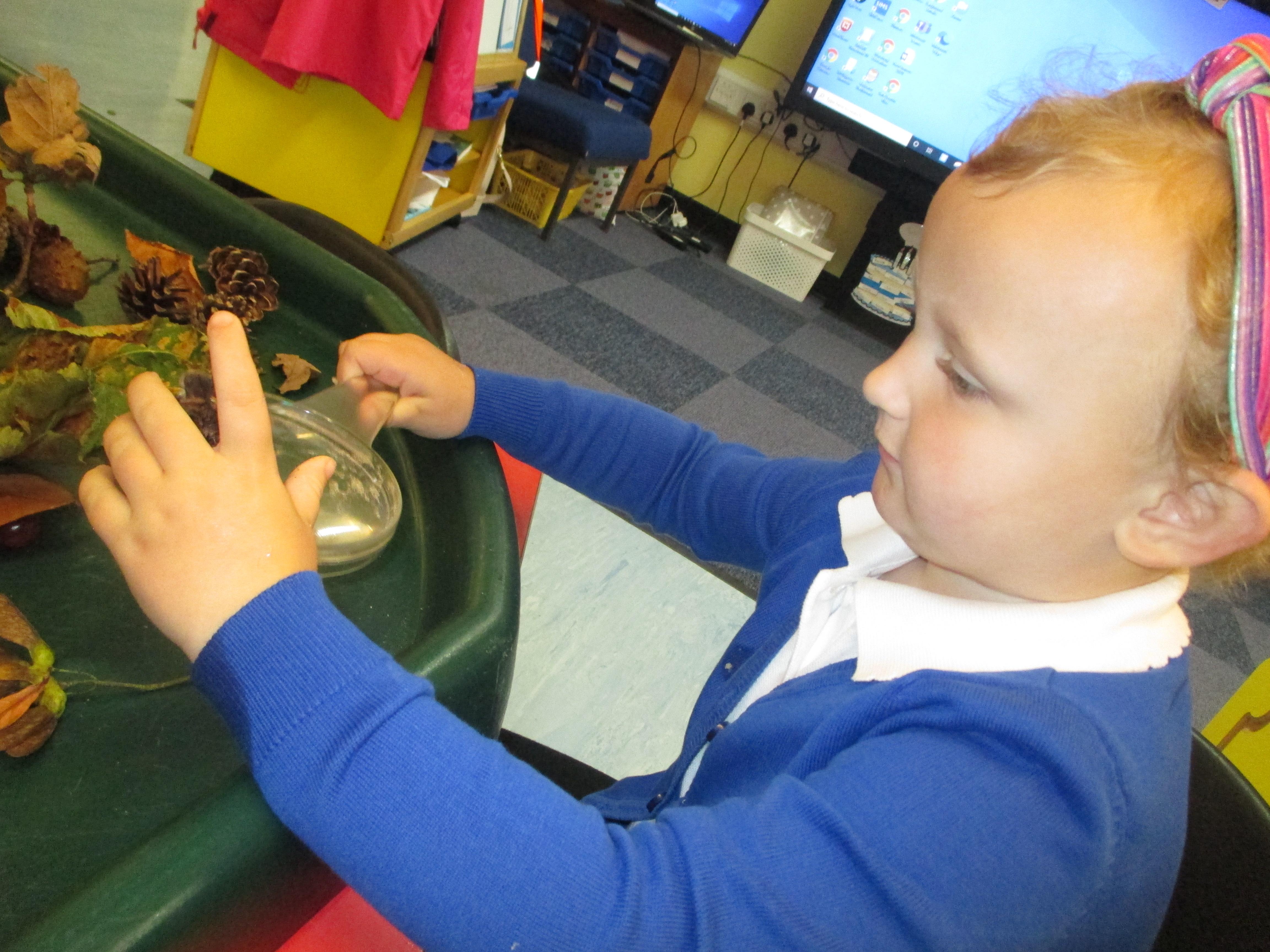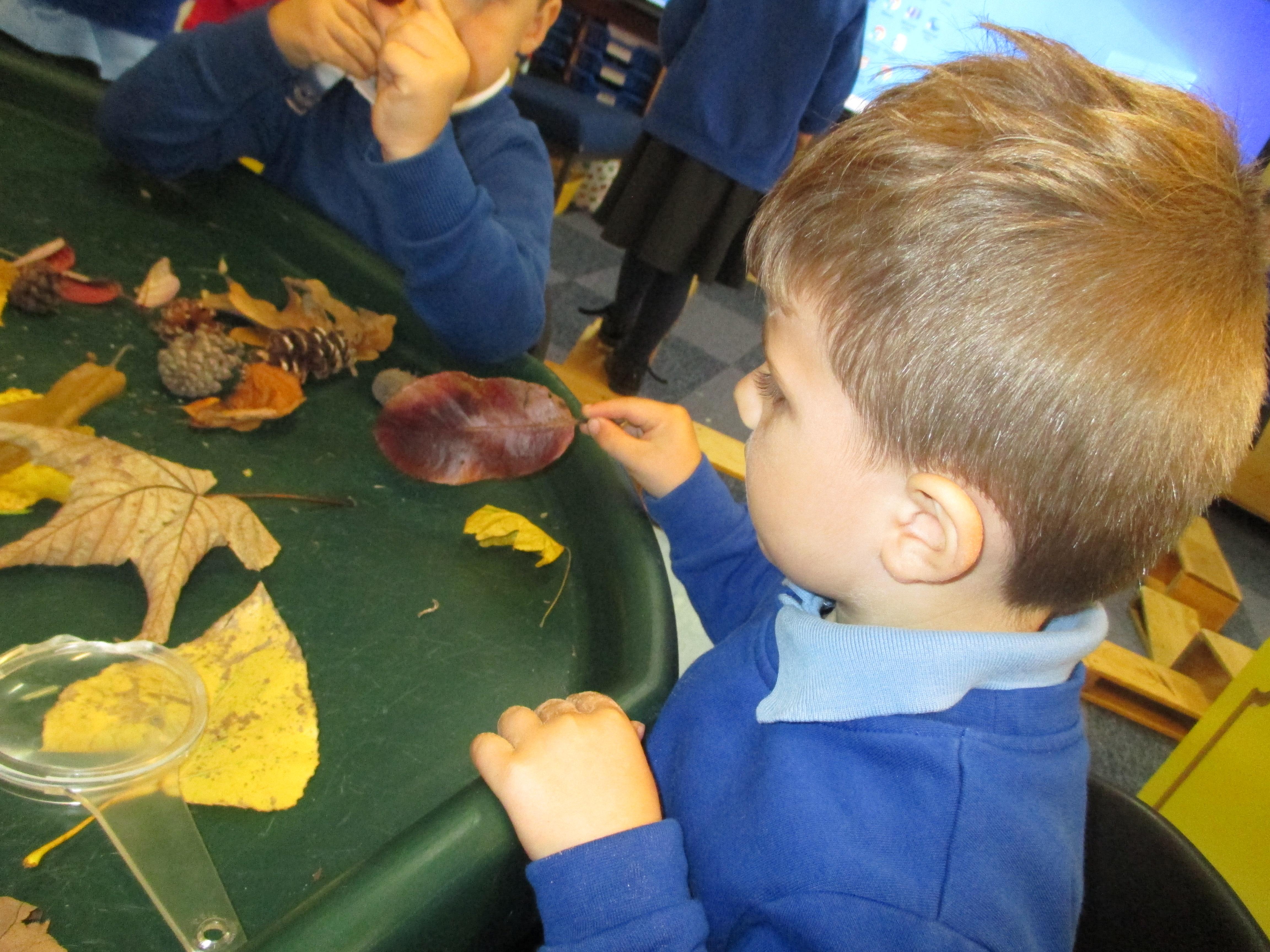 We have been talking about the season of 'Autumn'. We exploring different objects that we can find in Autumn such as pine cones, conkers, conker shells and coloured leaves. We have been exploring how they feel and have been thinking of our own describing words.