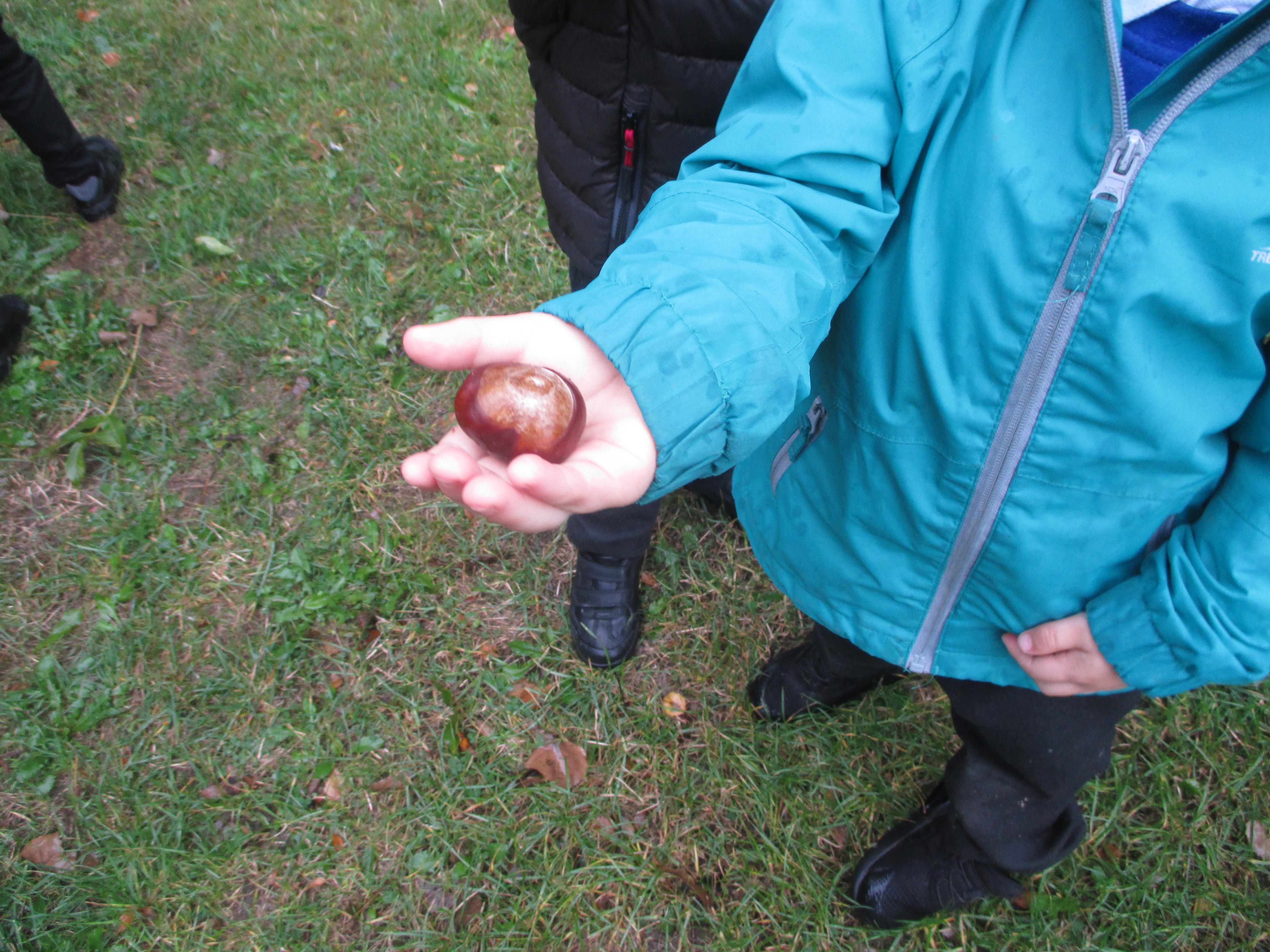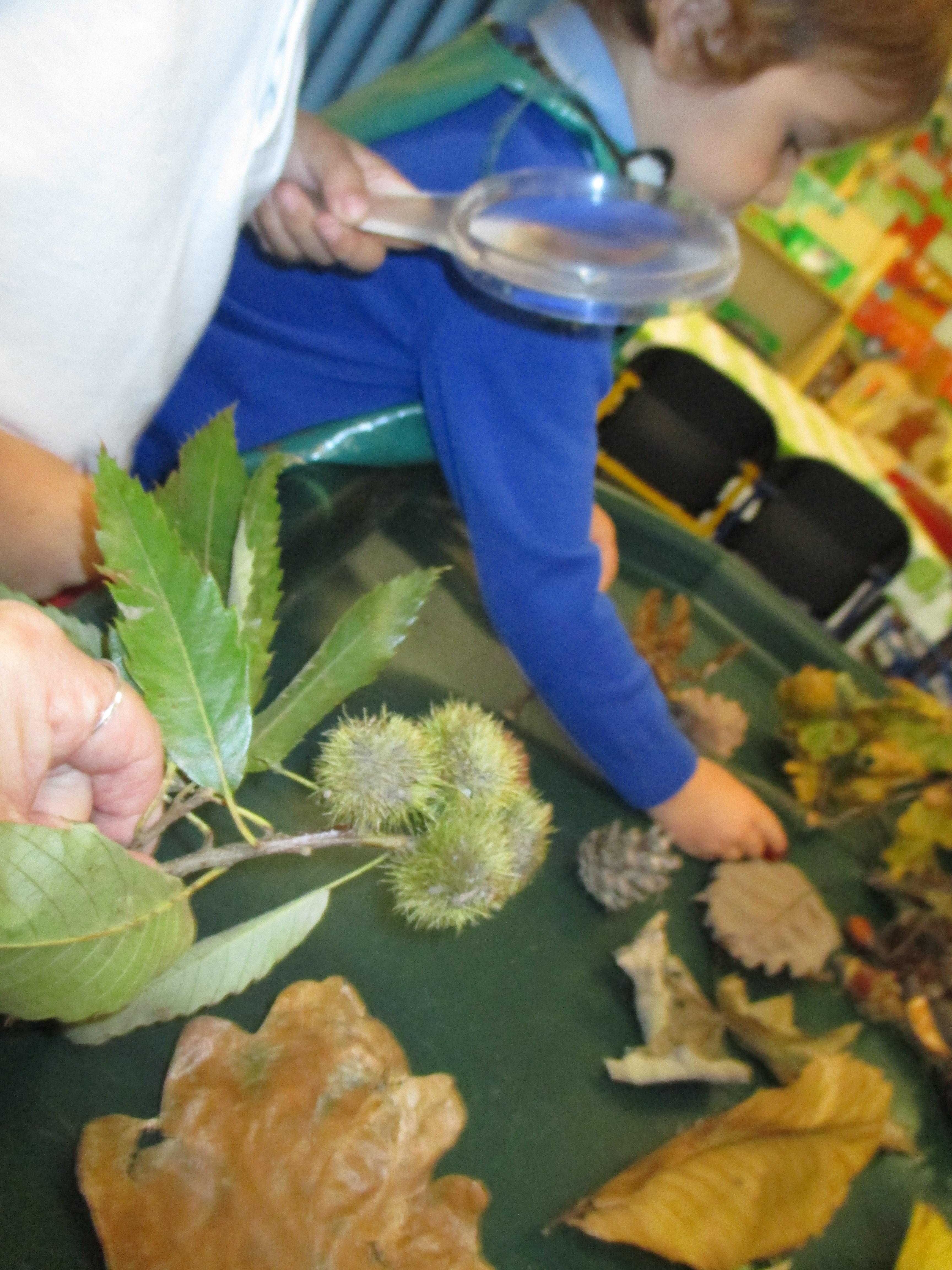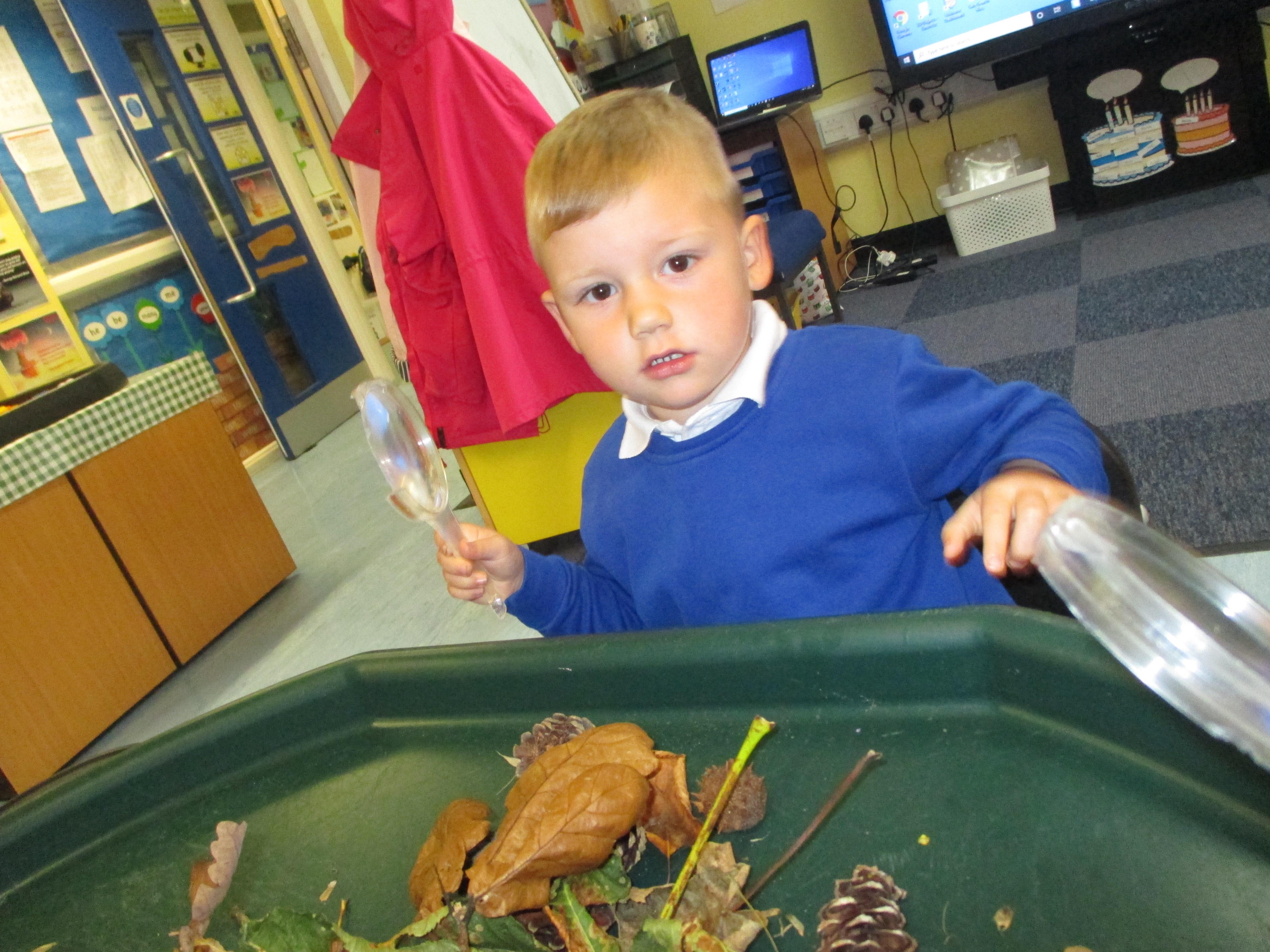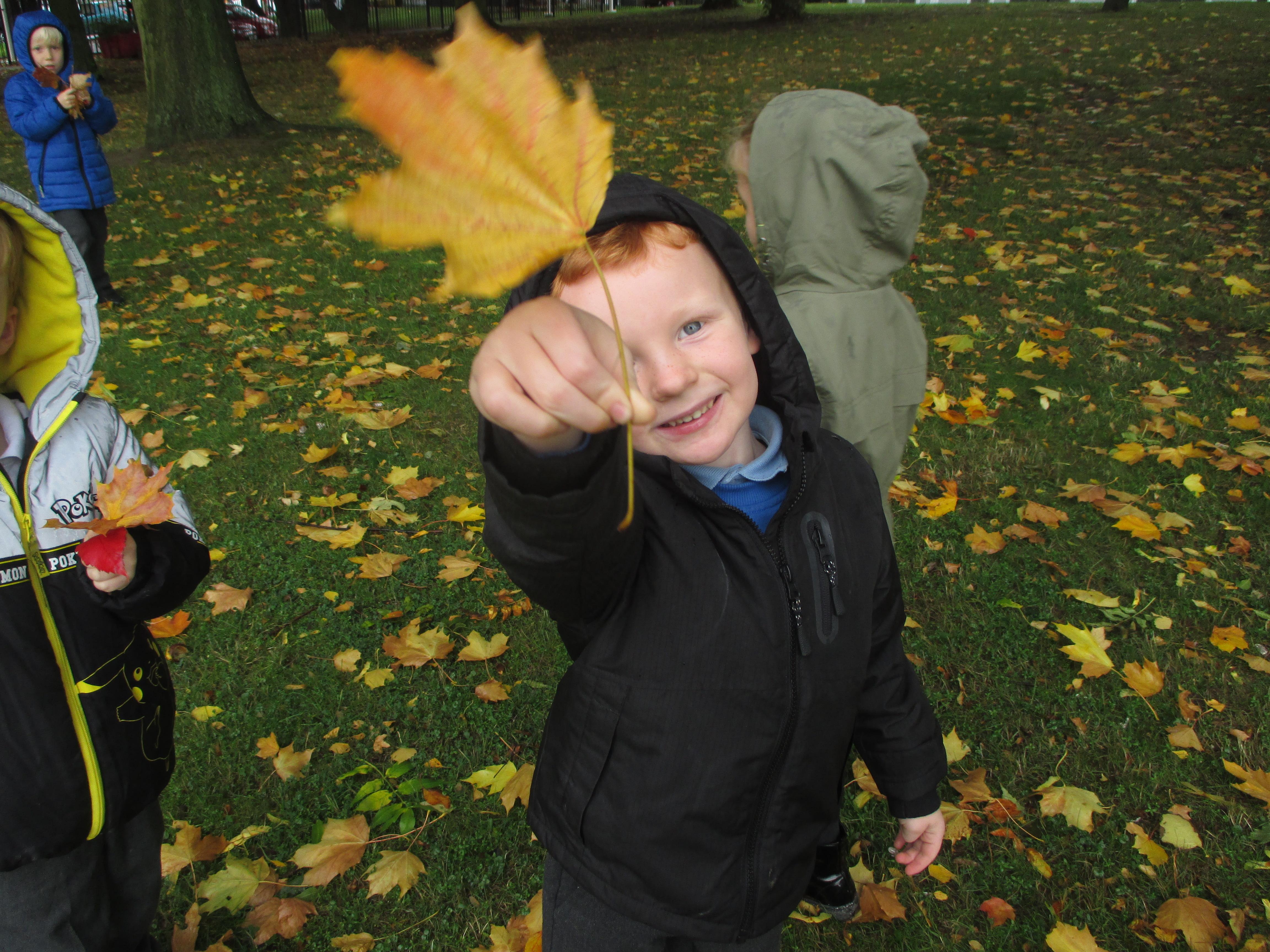 We have been talking about the season of 'Autumn'. We exploring different objects that we can find in Autumn such as pine cones, conkers, conker shells and coloured leaves. We have been exploring how they feel and have been thinking of our own describing words.