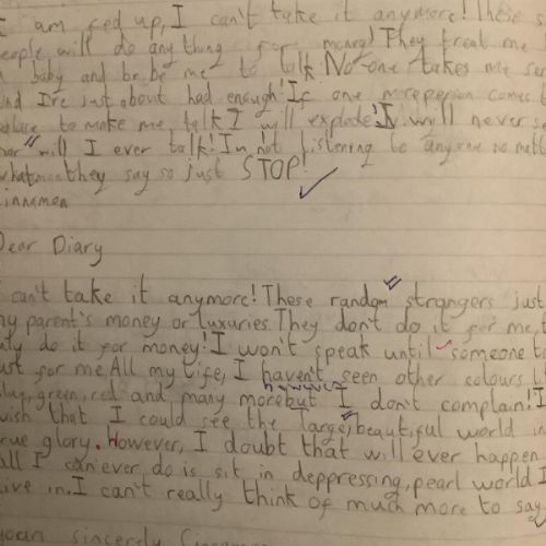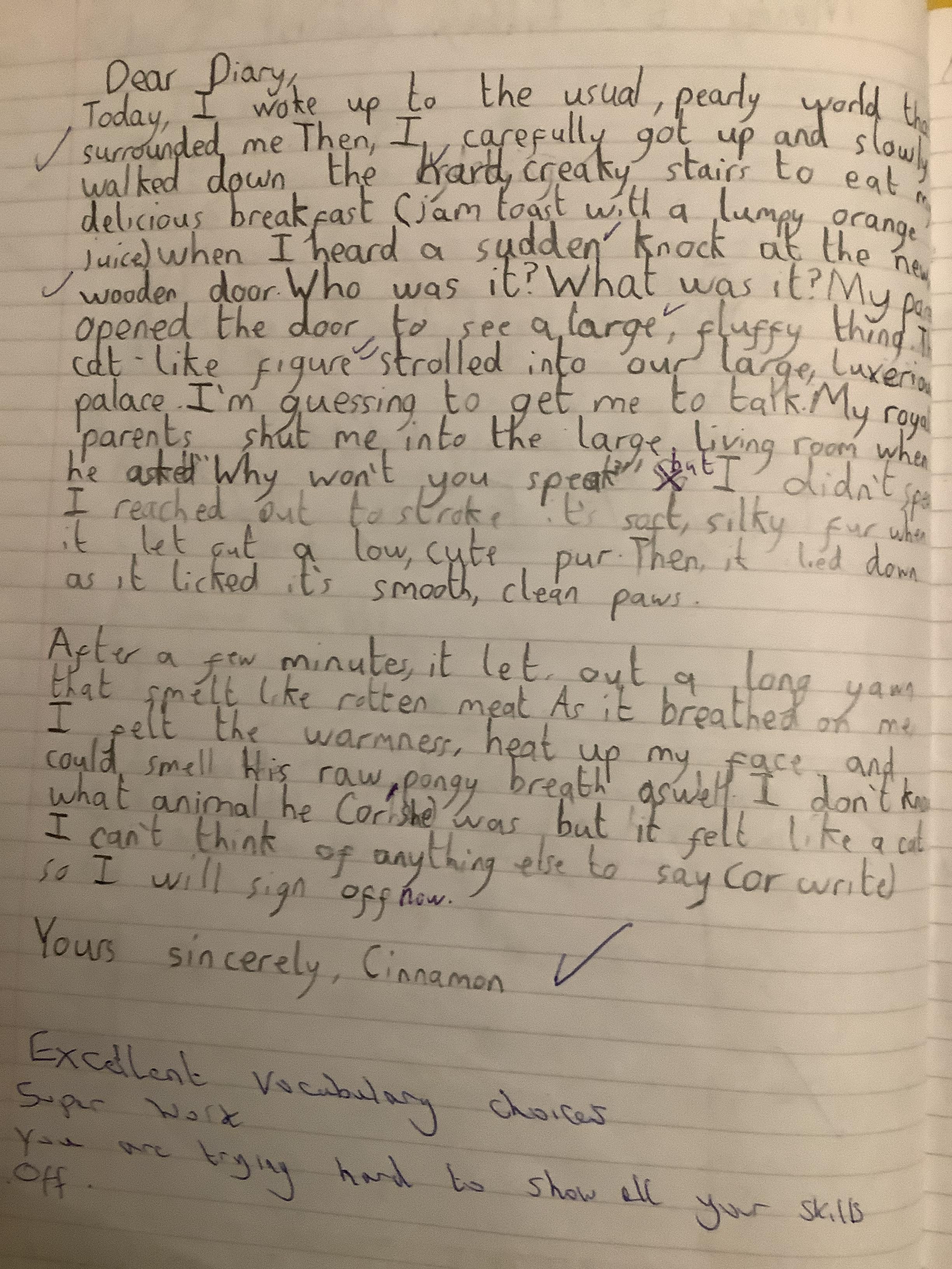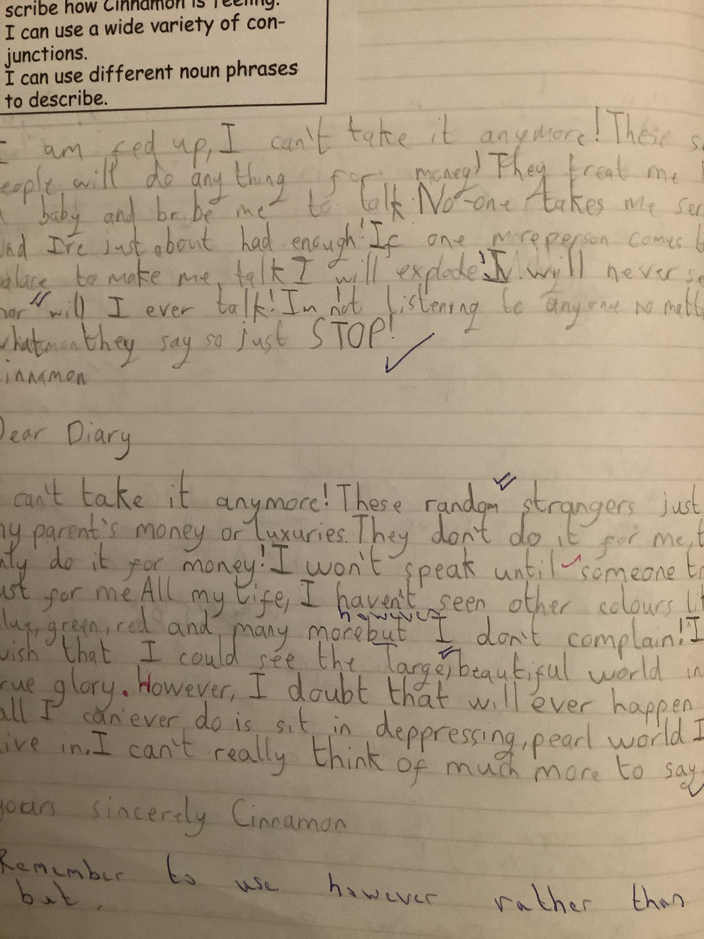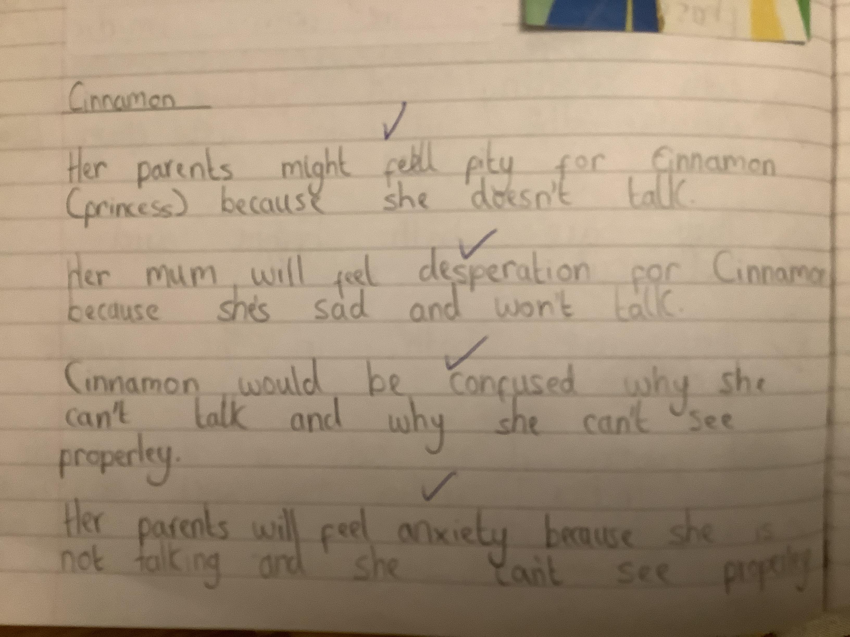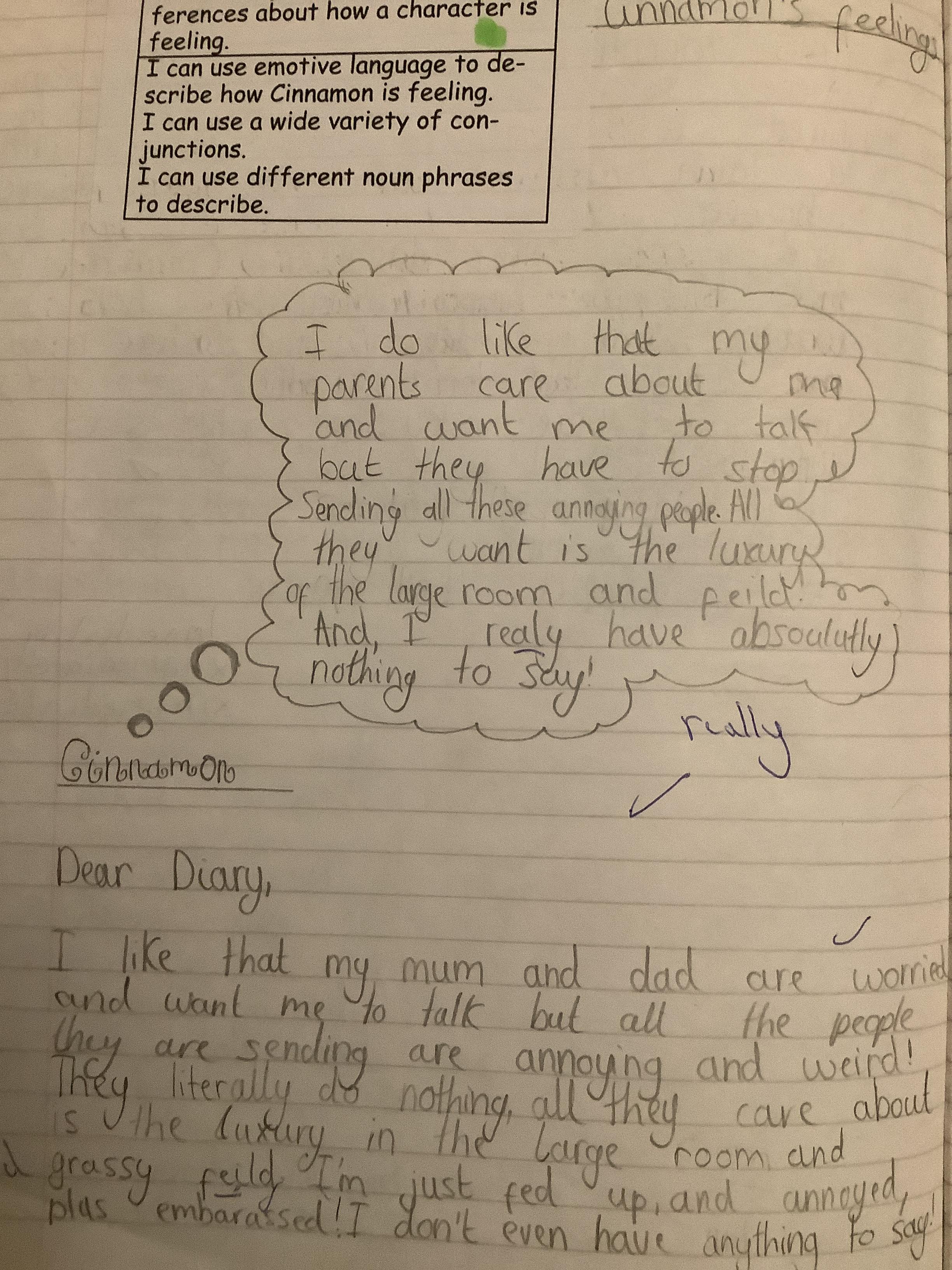 We wrote another extract of Cinnamon's diary to explain how she felt when she could finally speak.
