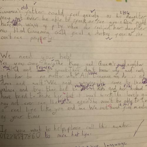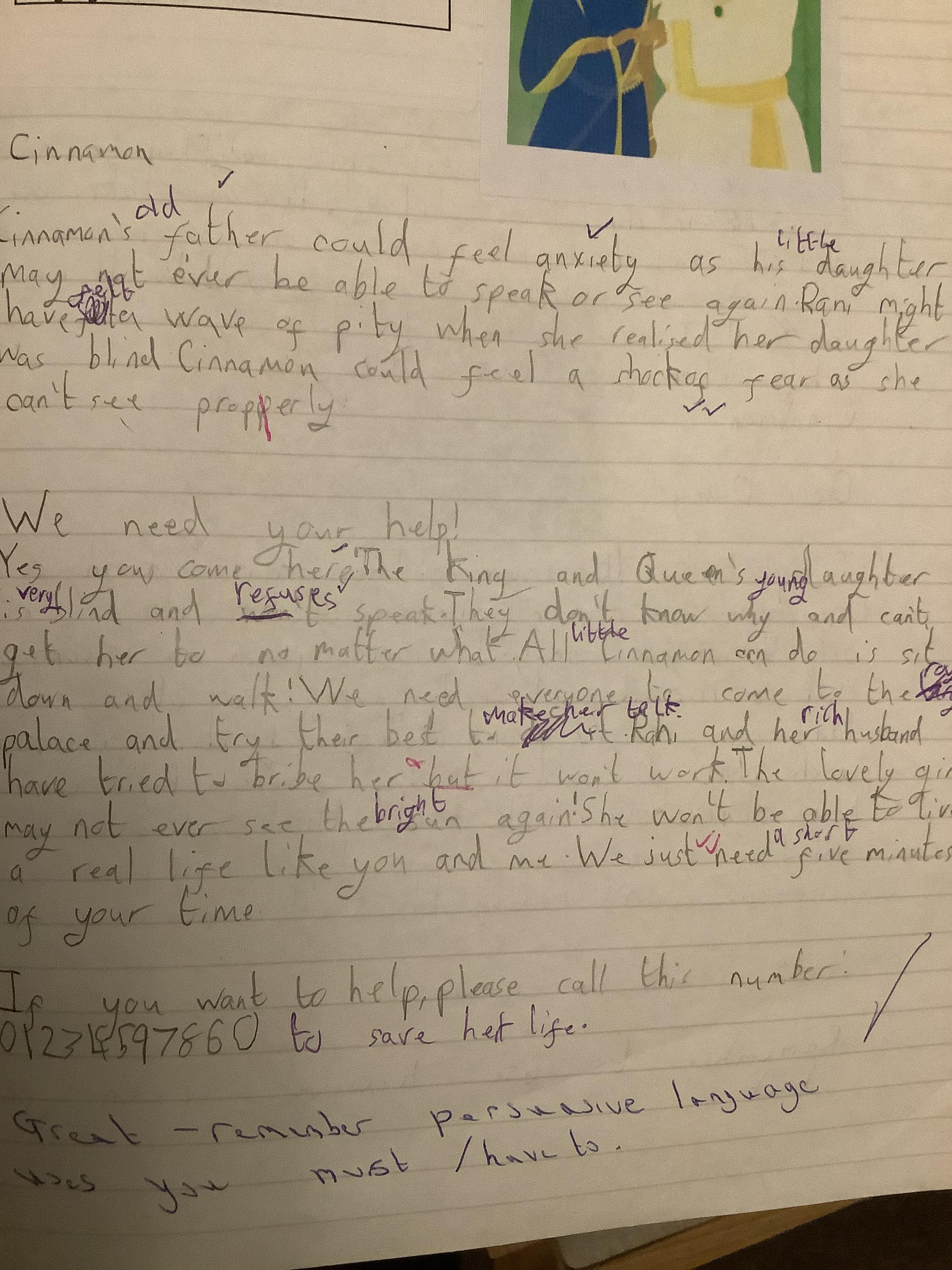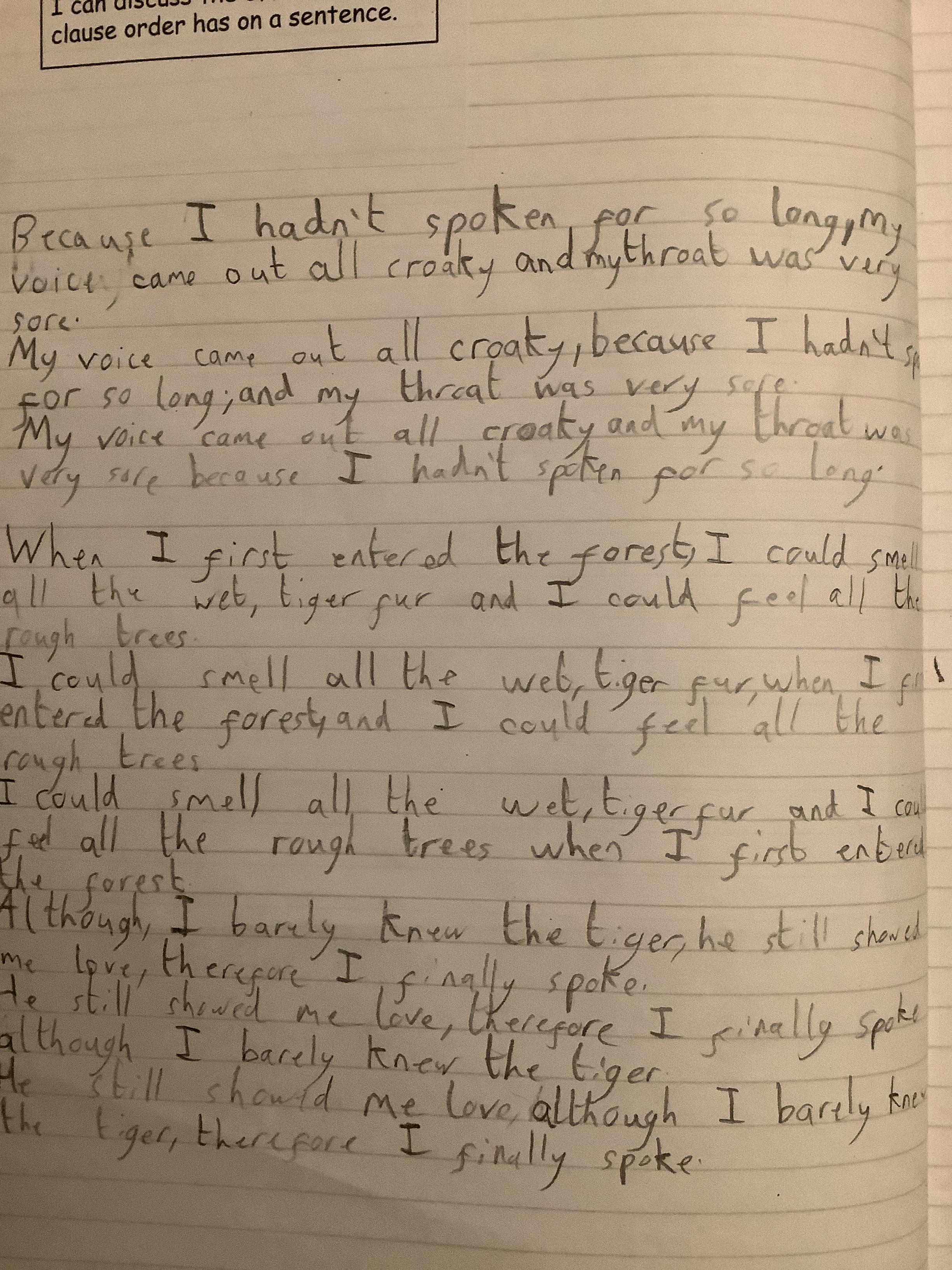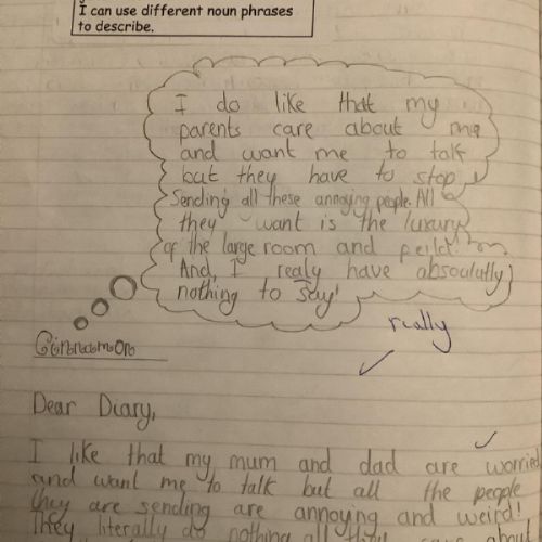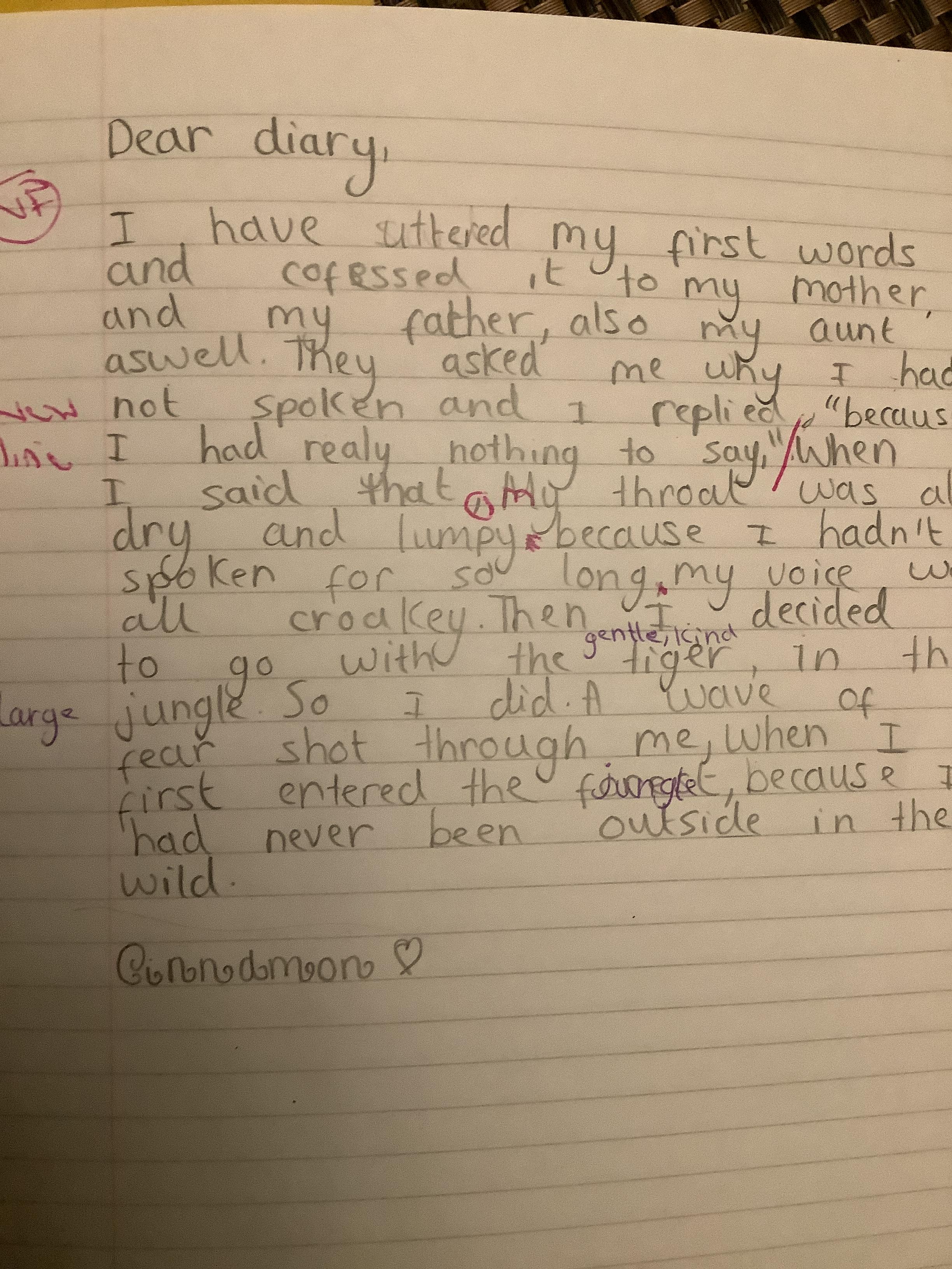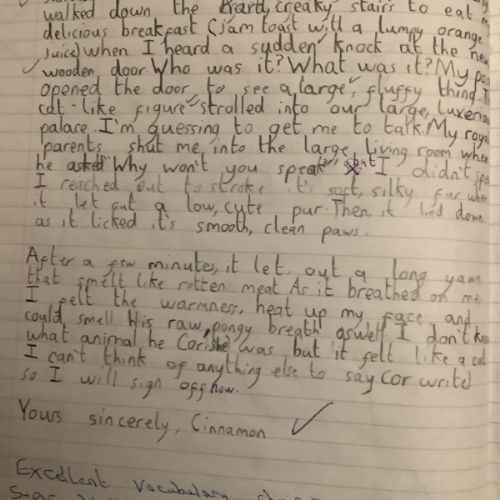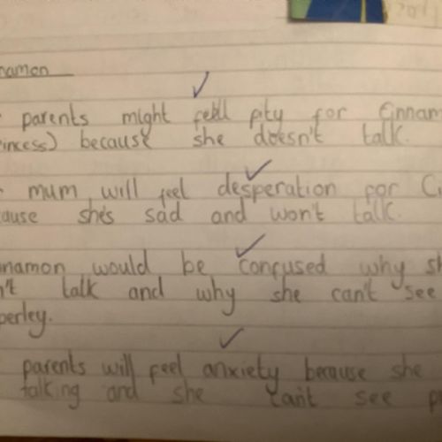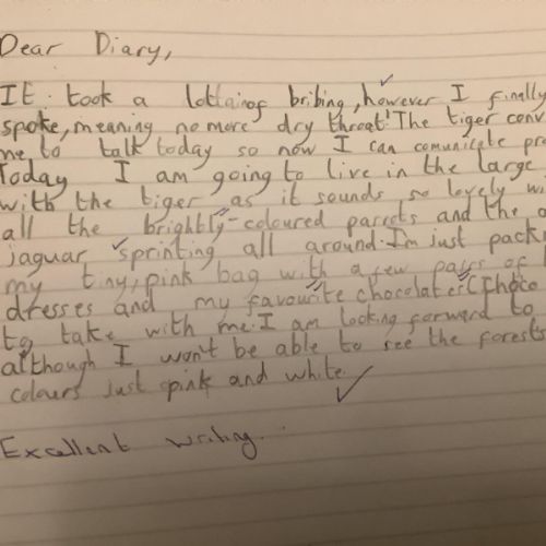 We wrote another extract of Cinnamon's diary to explain how she felt when she could finally speak.