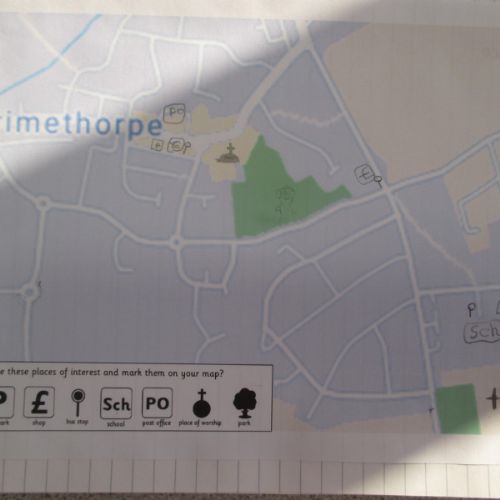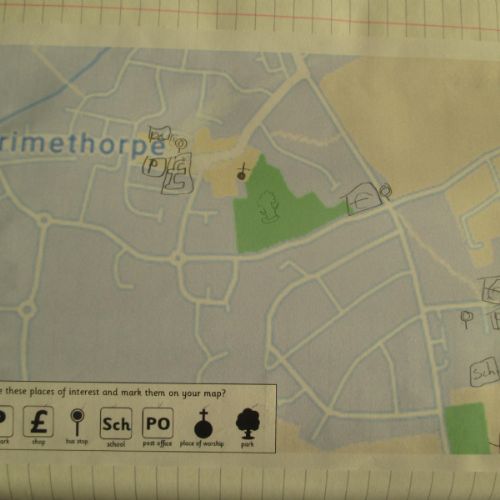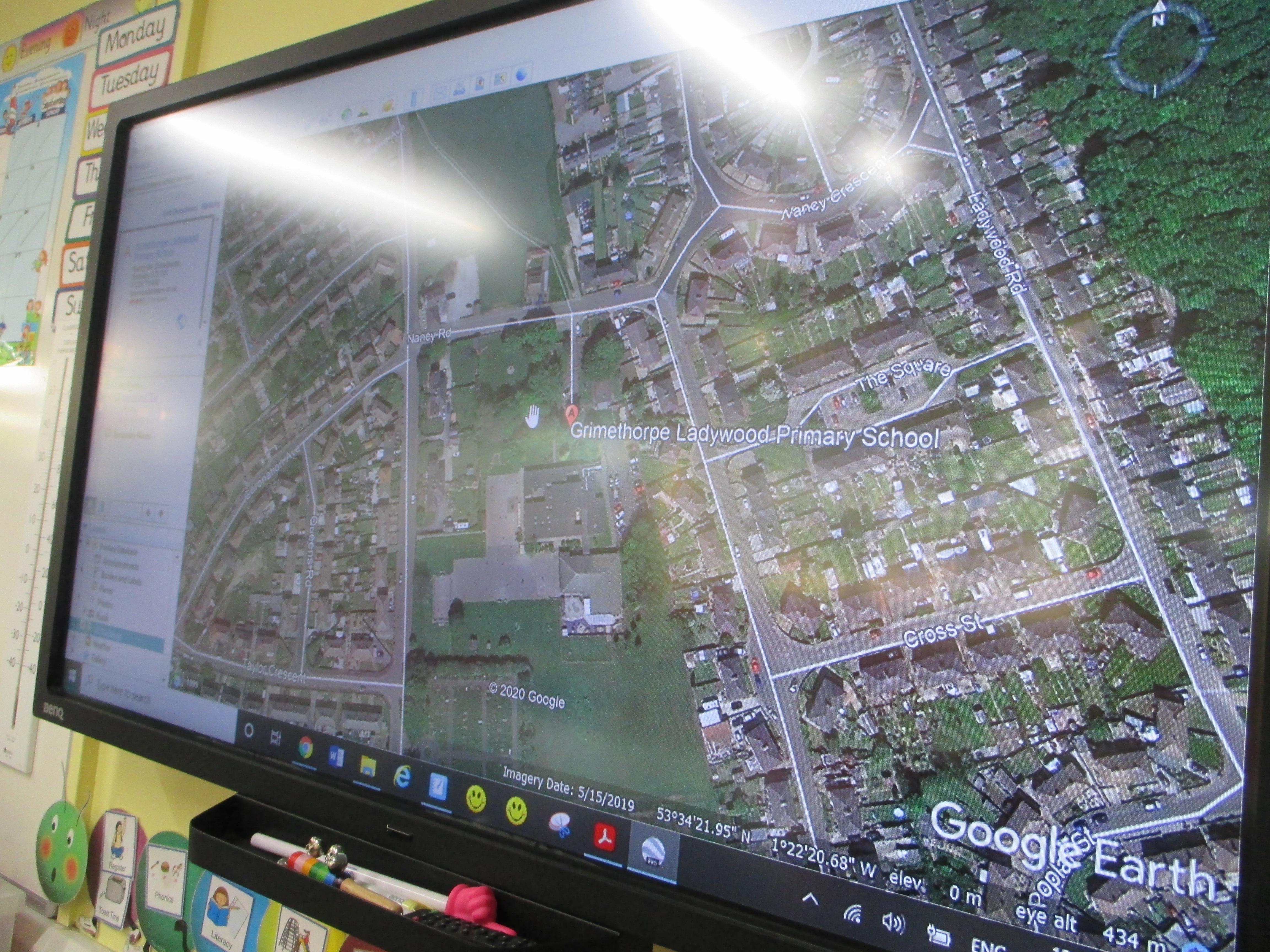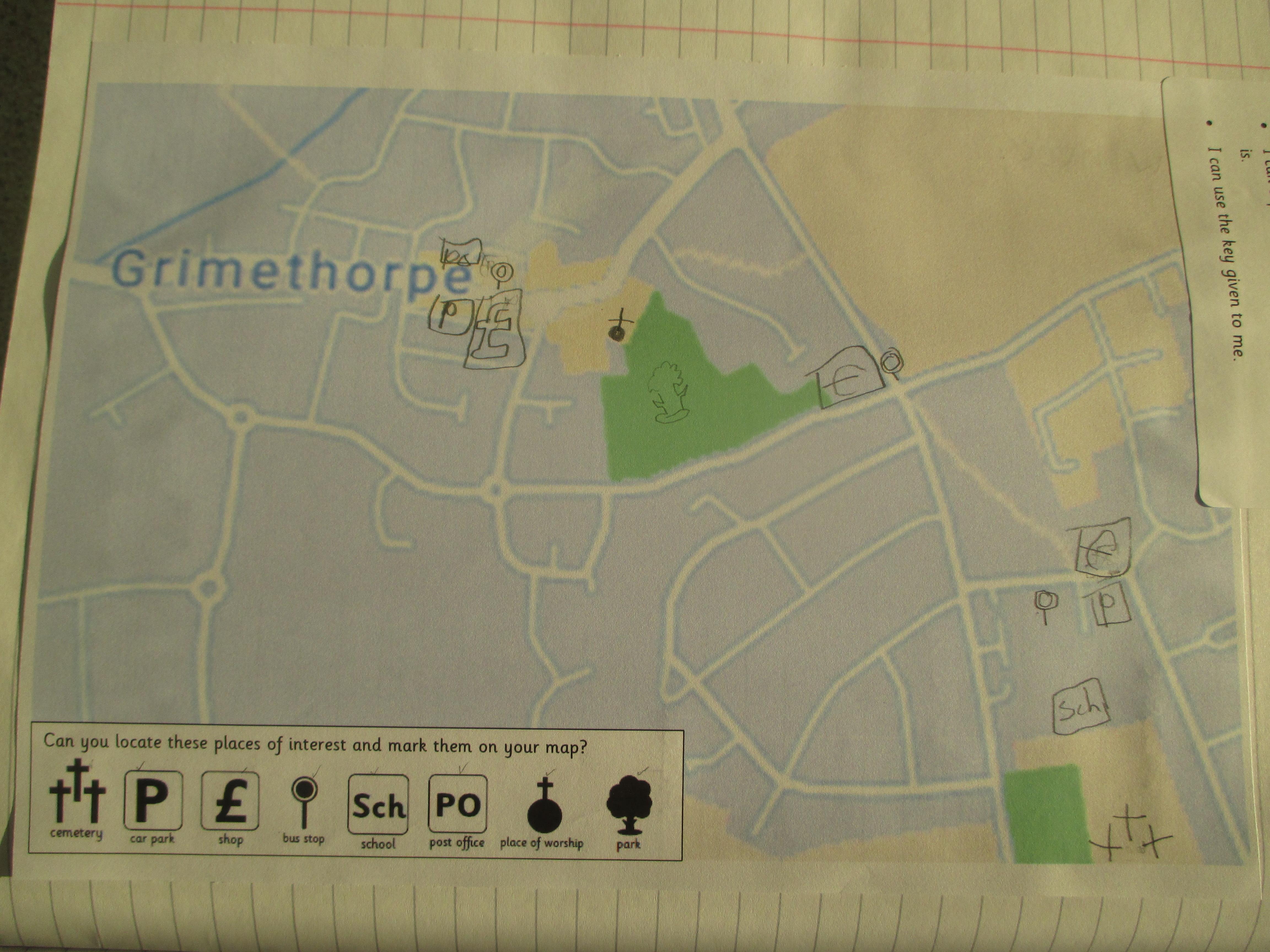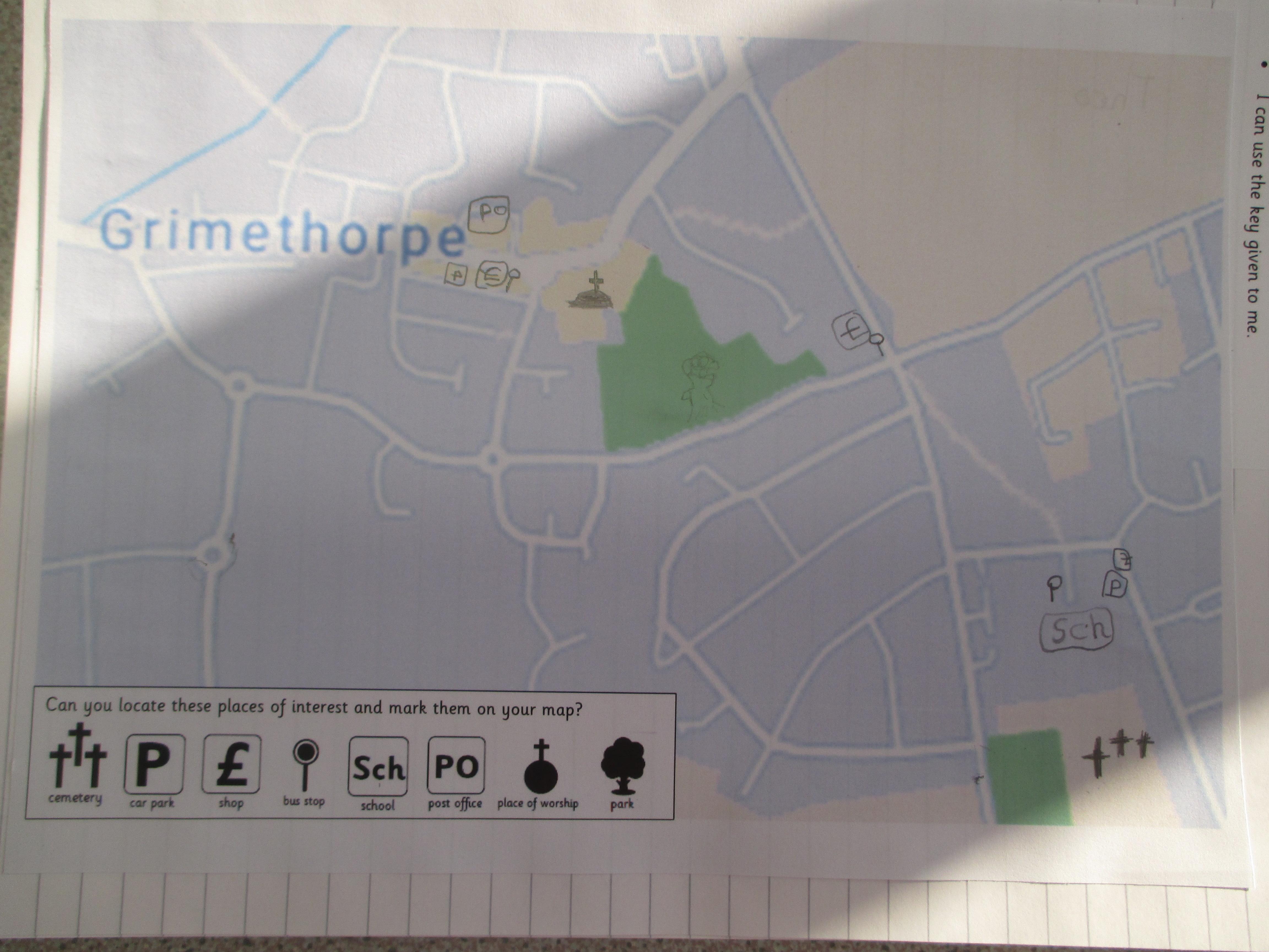 We looked at some maps of towns and cities, describing what we could see and found out why symbols and keys are useful when using maps.  We then went on a virtual trip around Grimethorpe using Google Earth.  We marked down the important places around Grimethorpe using symbols and a key.