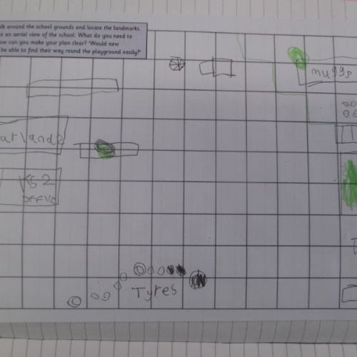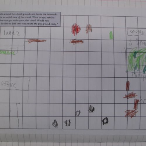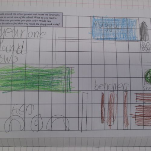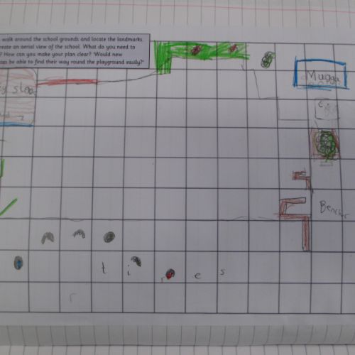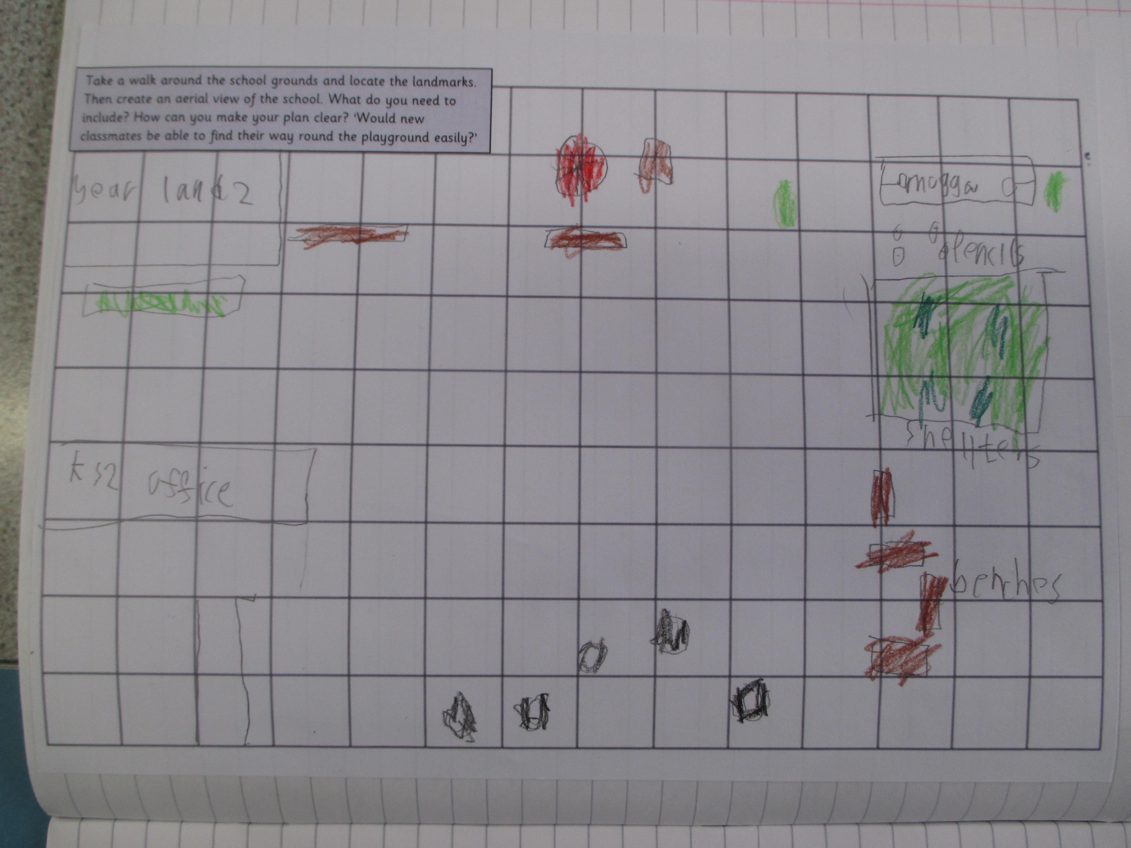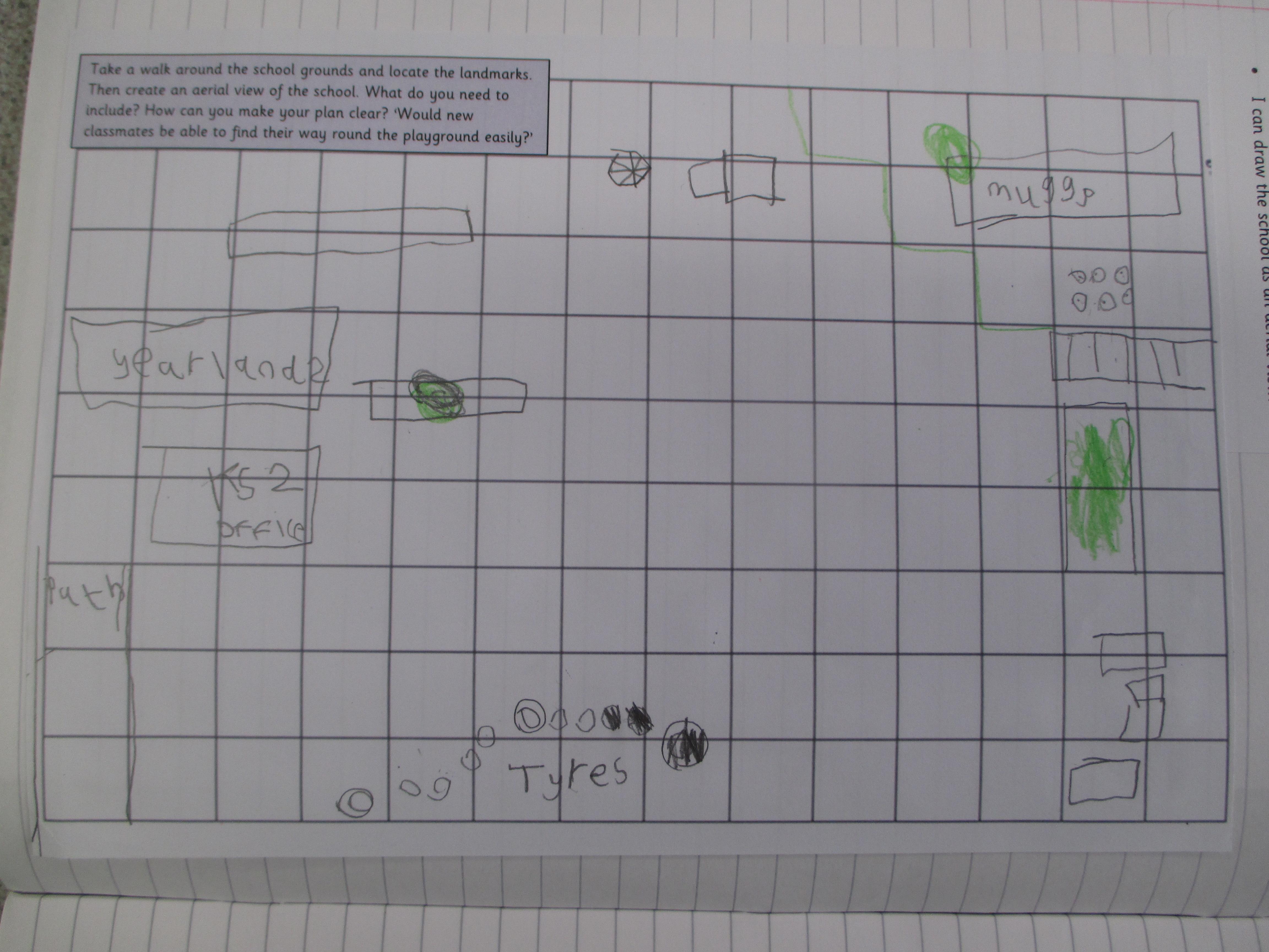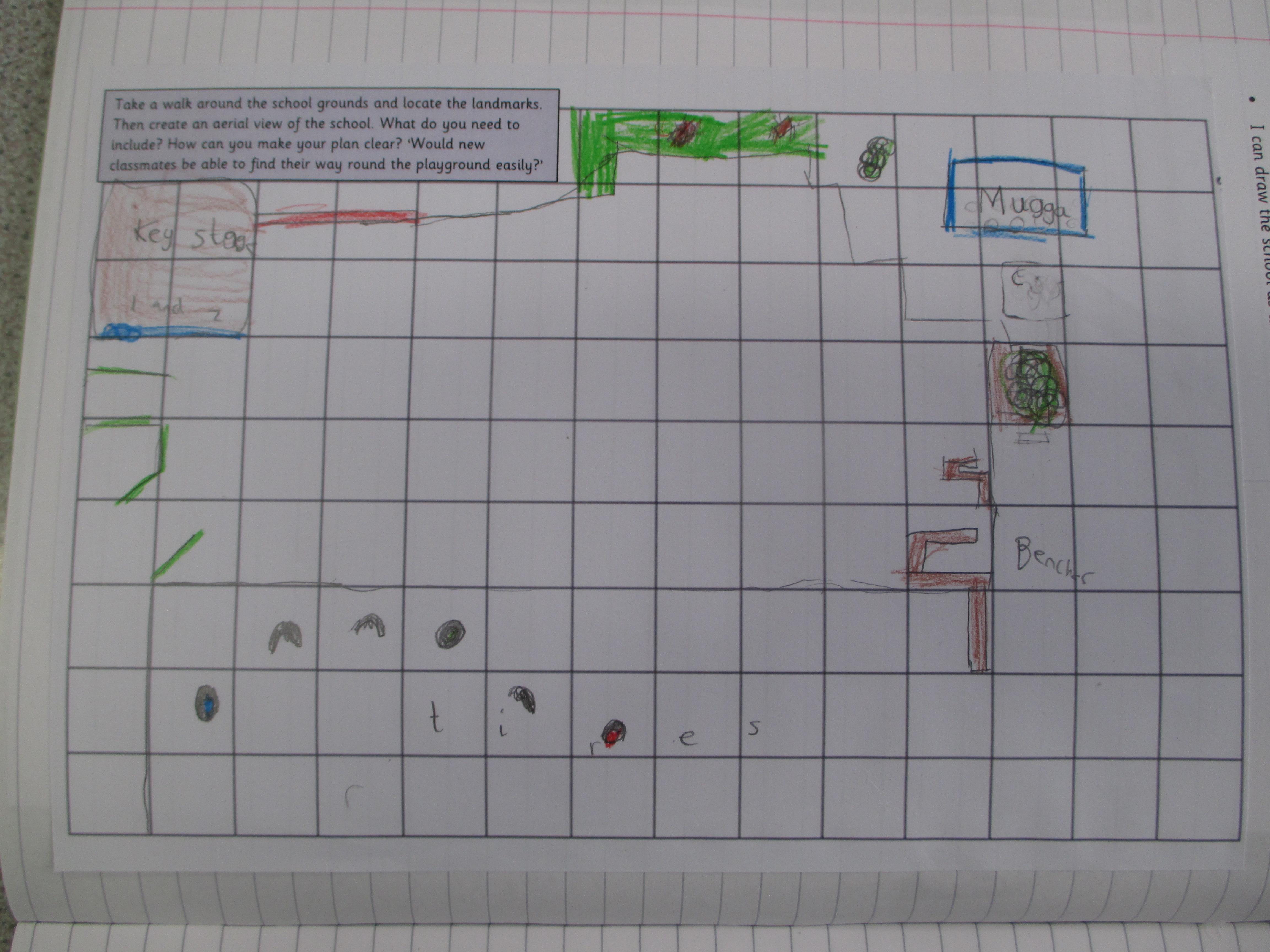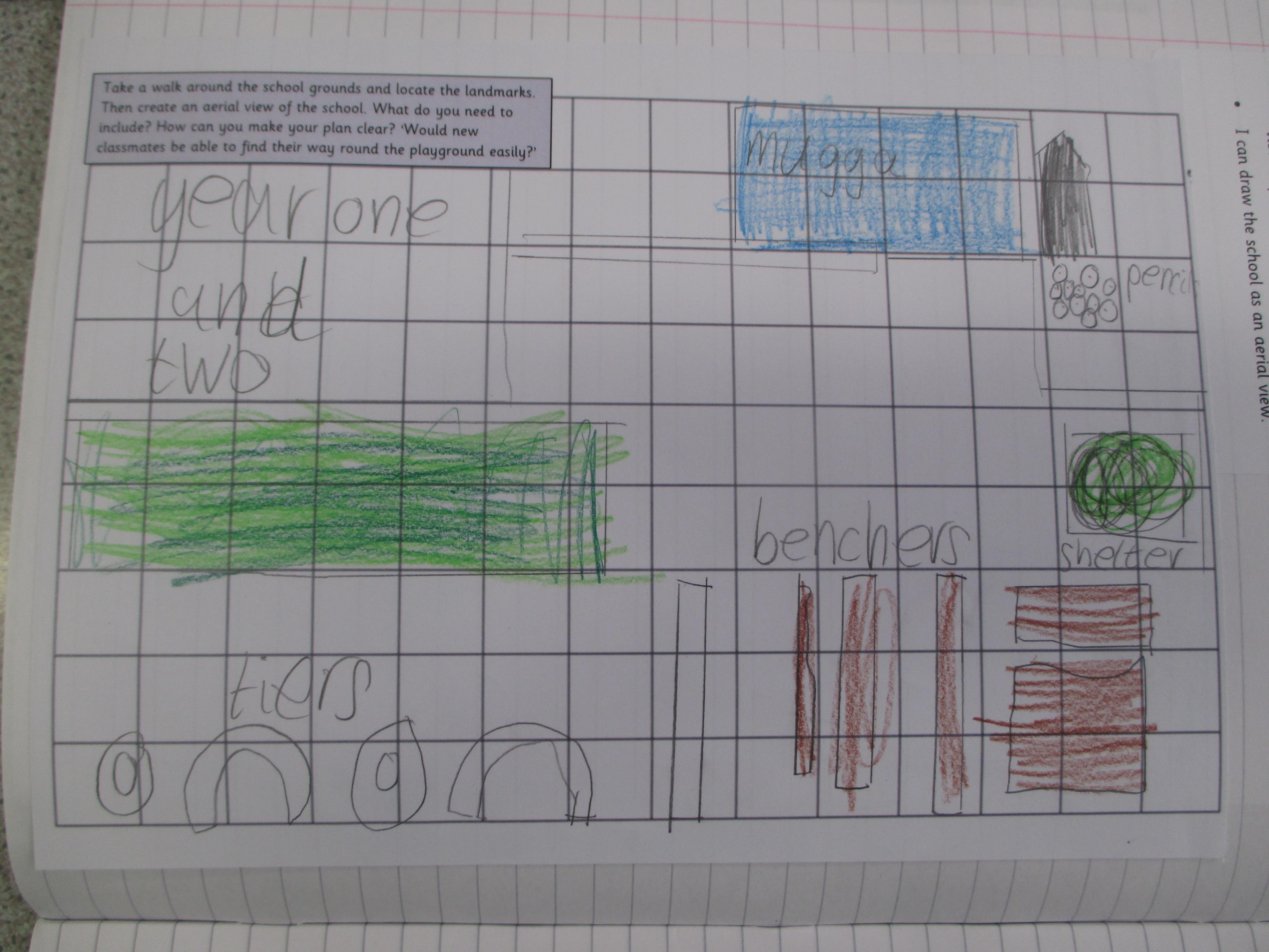 We explored aerial views and identified some different locations based on an aerial photograph.  We then looked at plan perspectives and we were challenged to draw a plan perspective of school grounds.