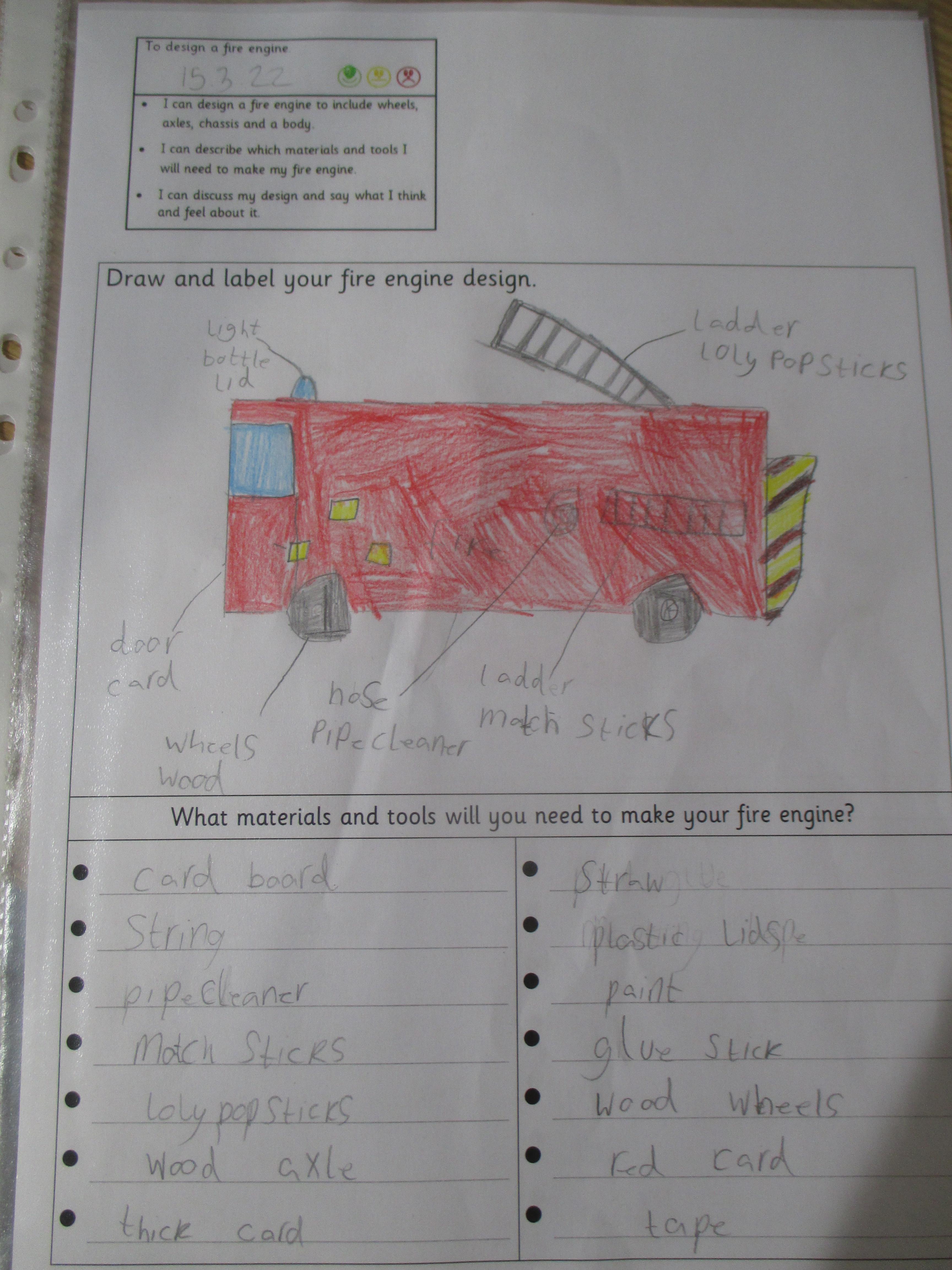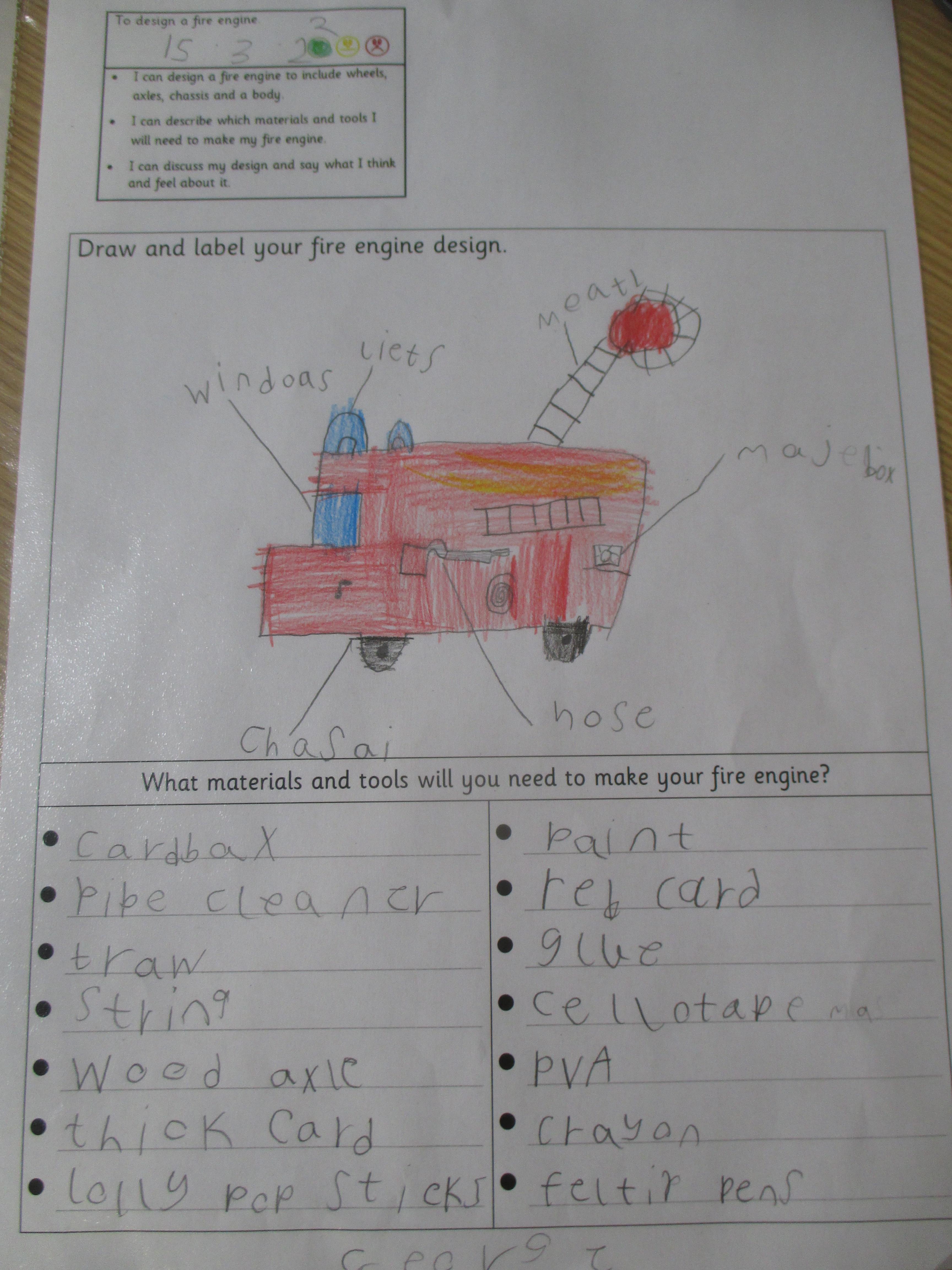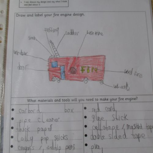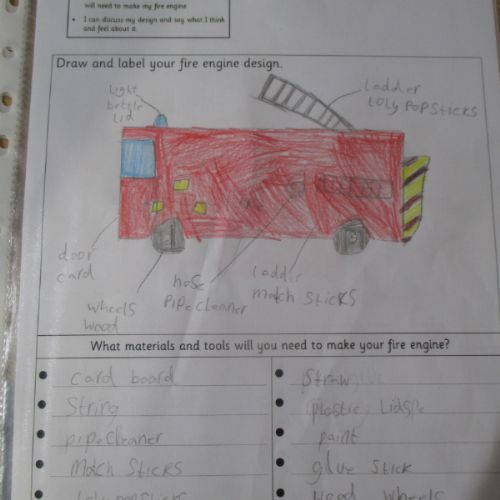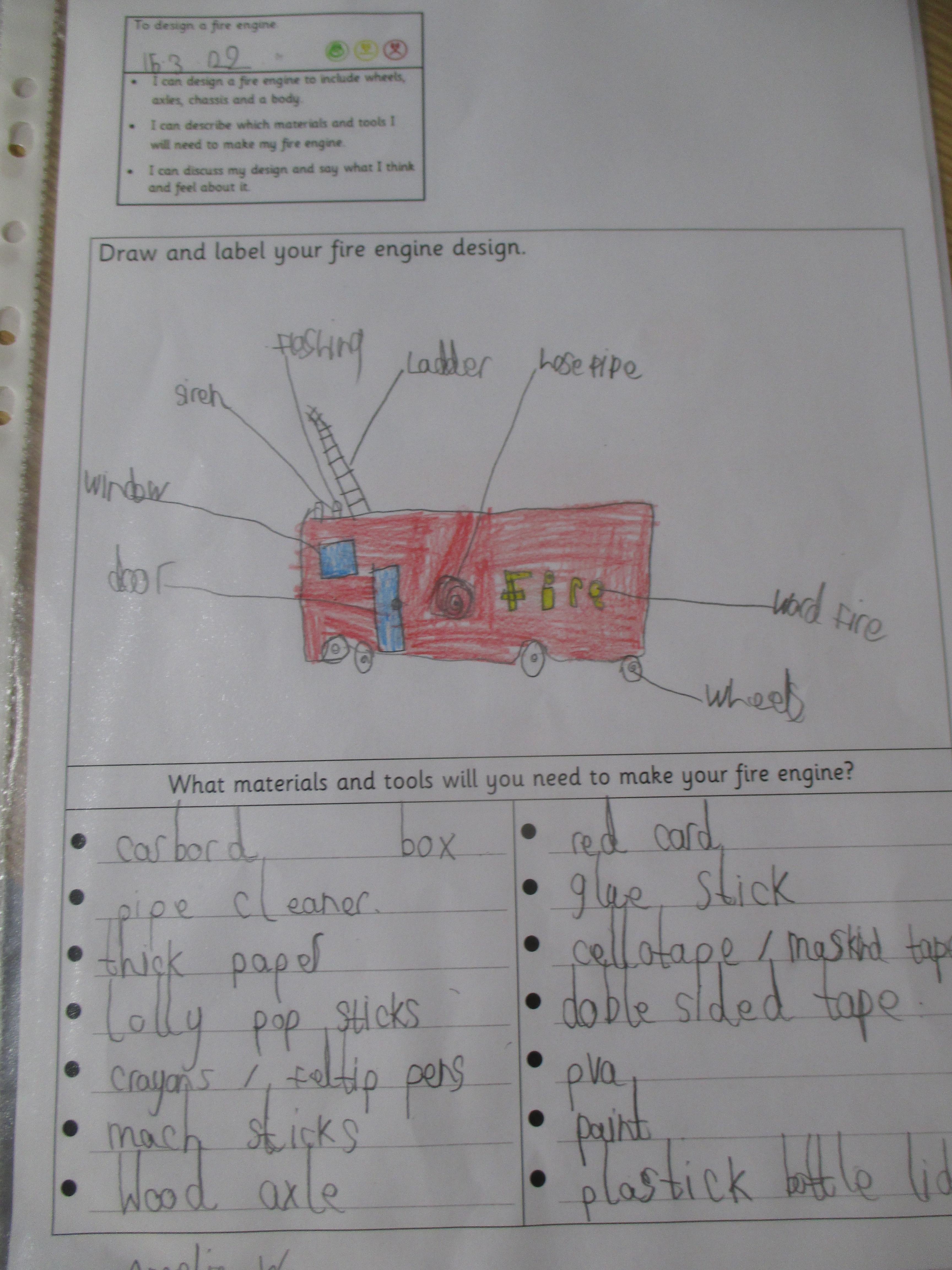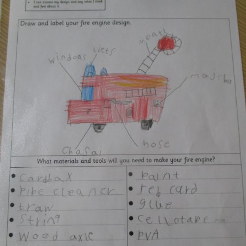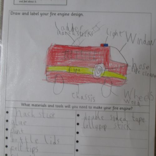 Today we designed our own fire engines, based on the learning we have undertaken so far. We considered which materials and tools we needed, noting our design ideas using notes and diagrams.