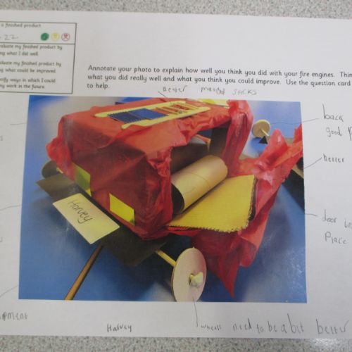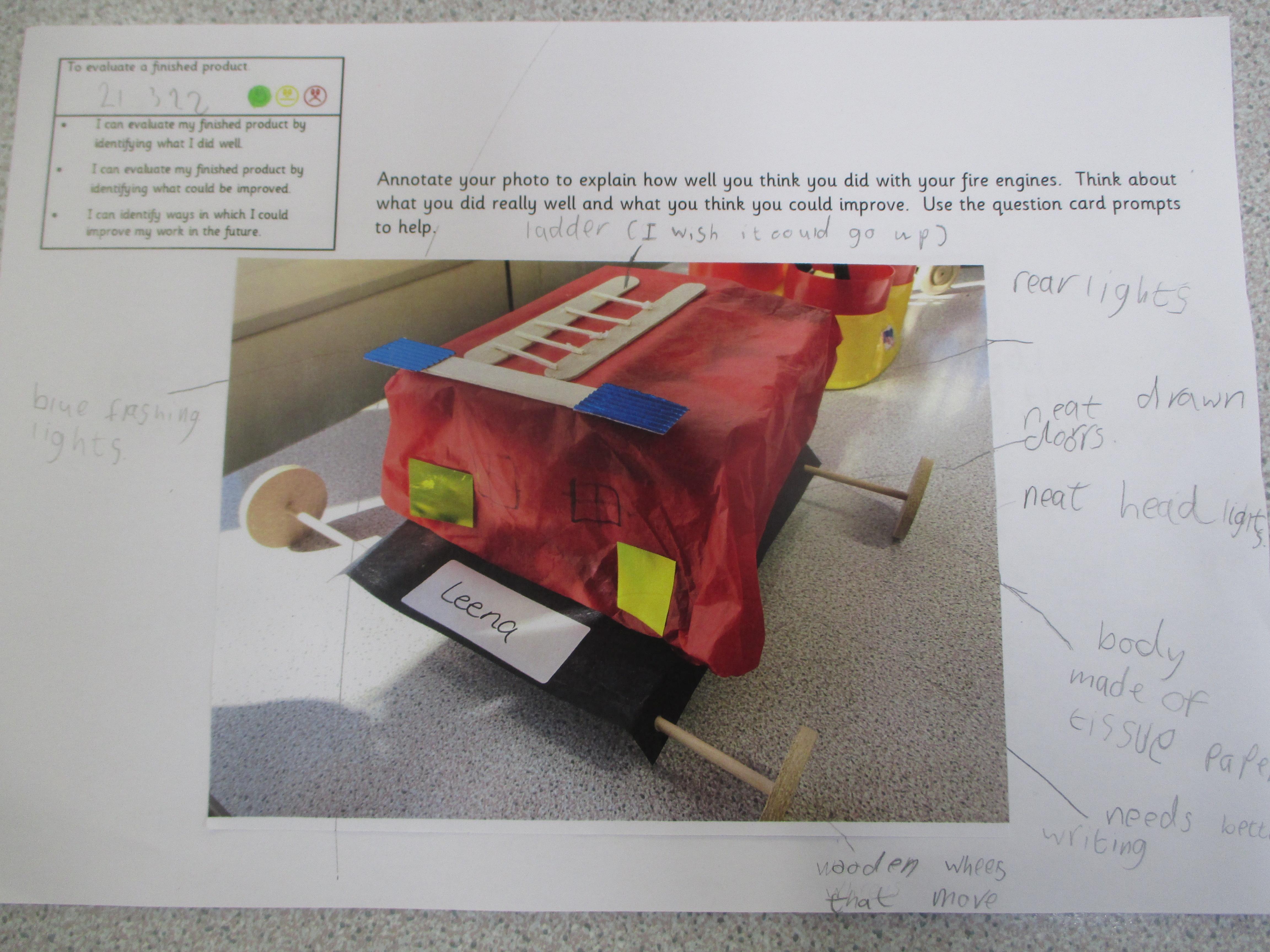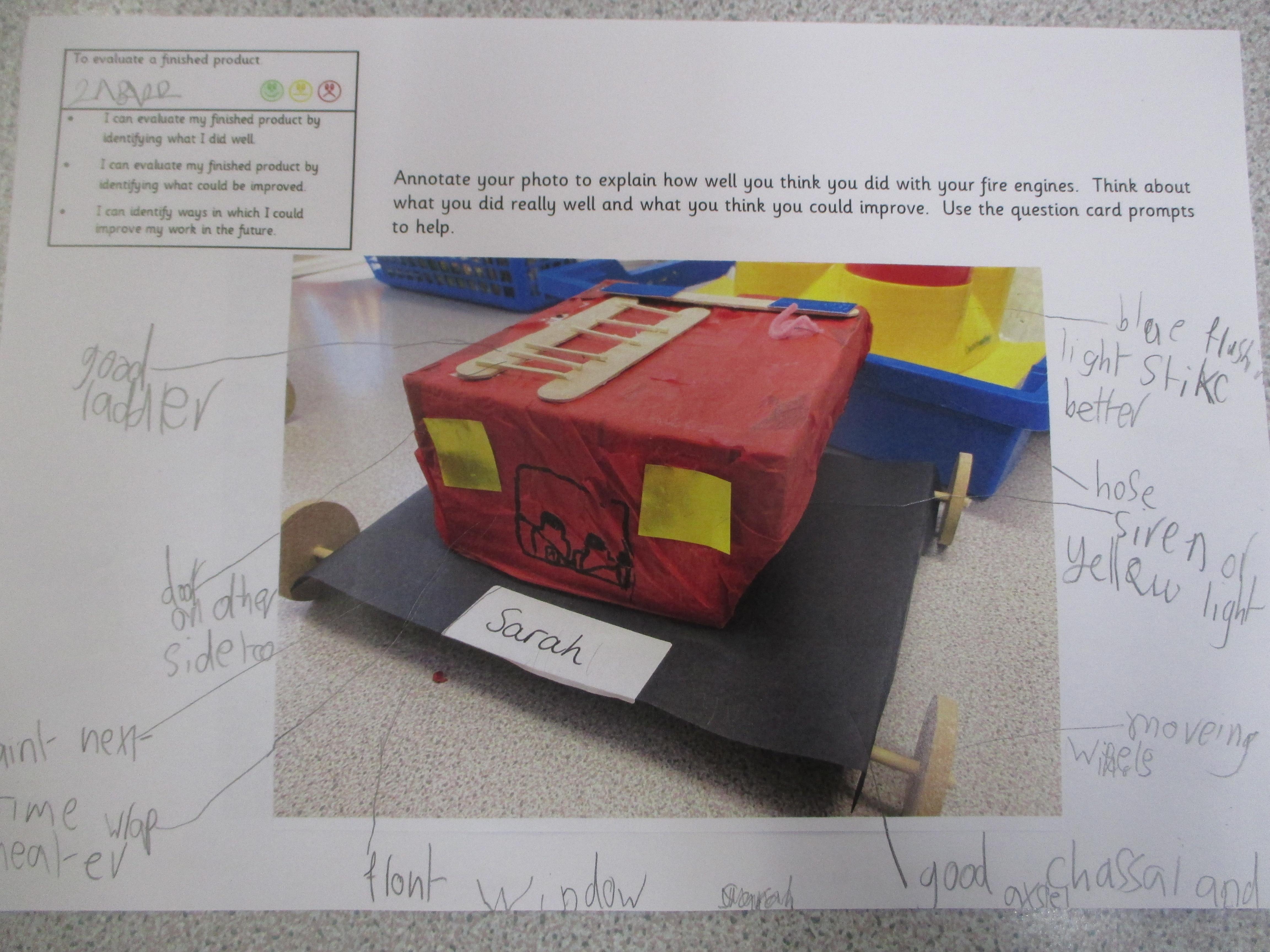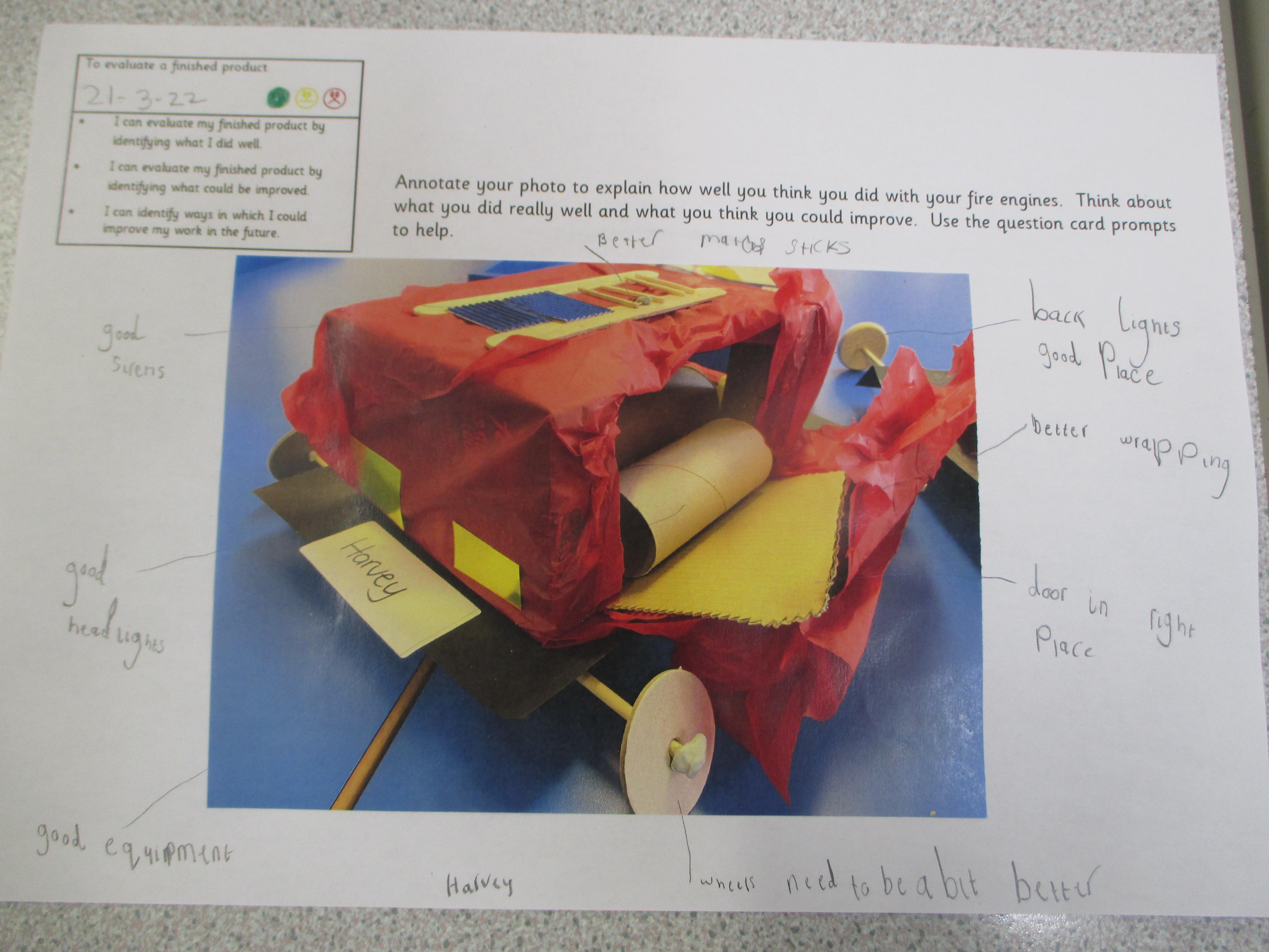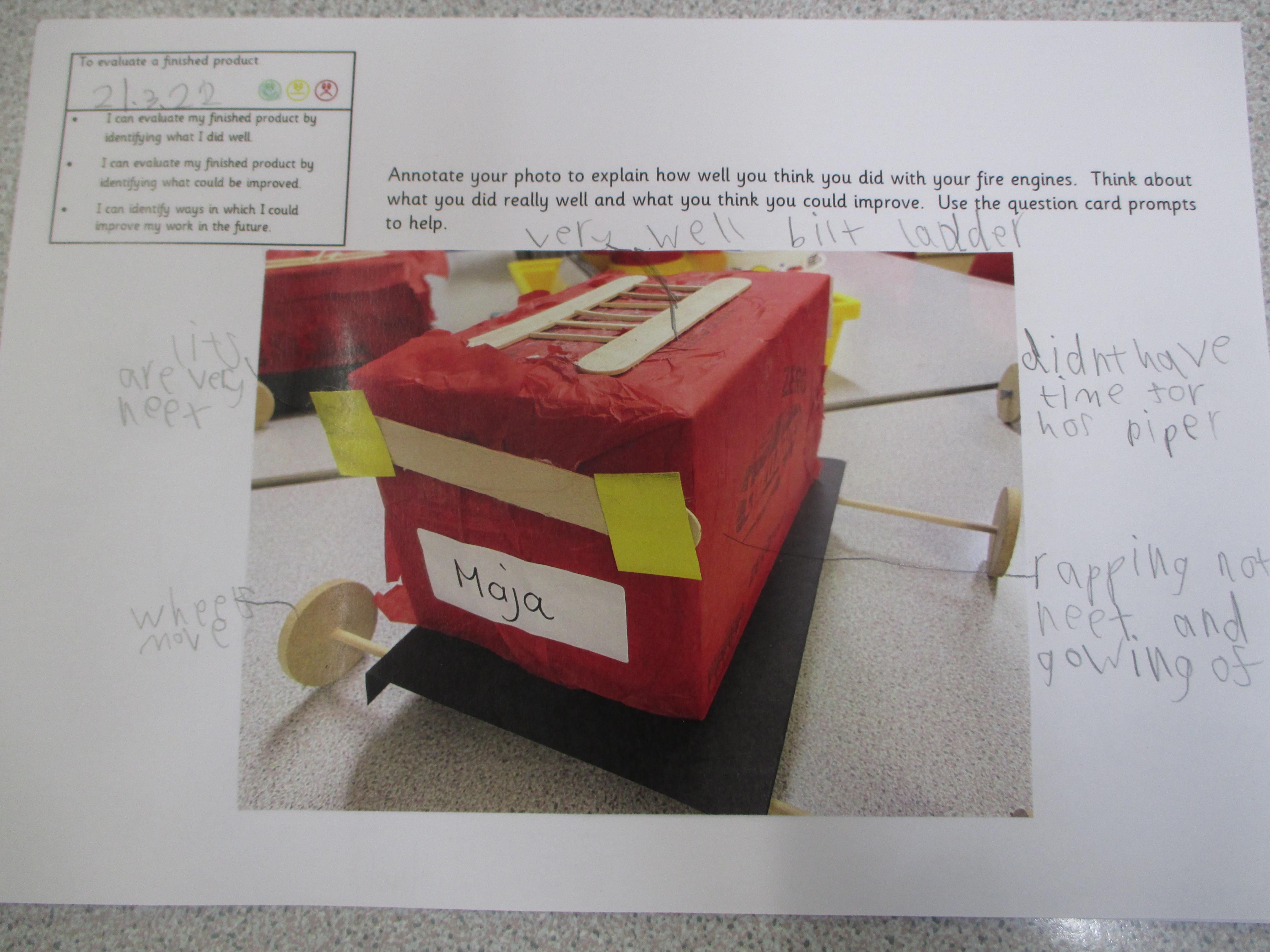 Today, we evaluated our fire engines. We thought about what went well, what could be improved upon and what we could do differently if we were to make our fire engines again.