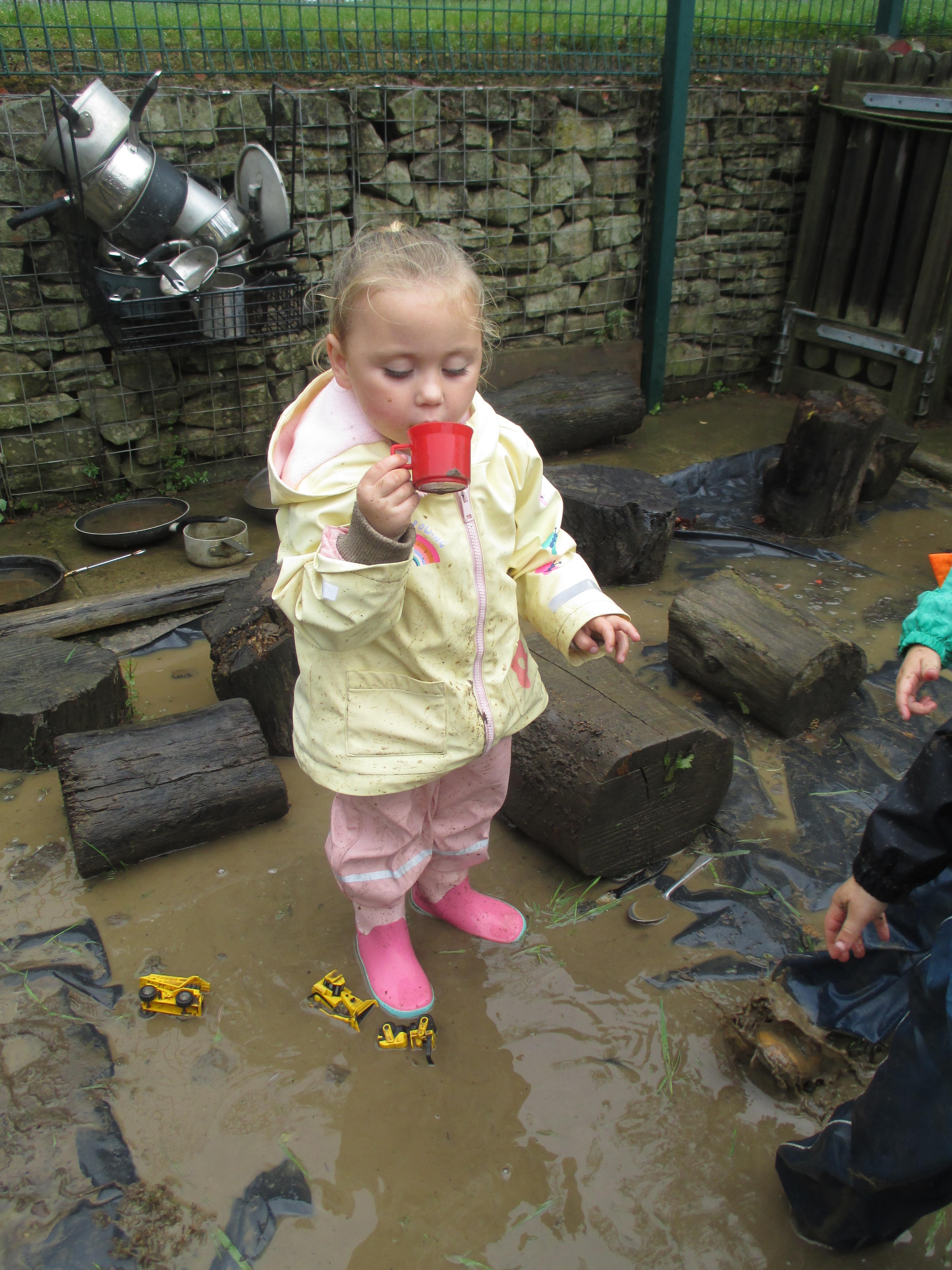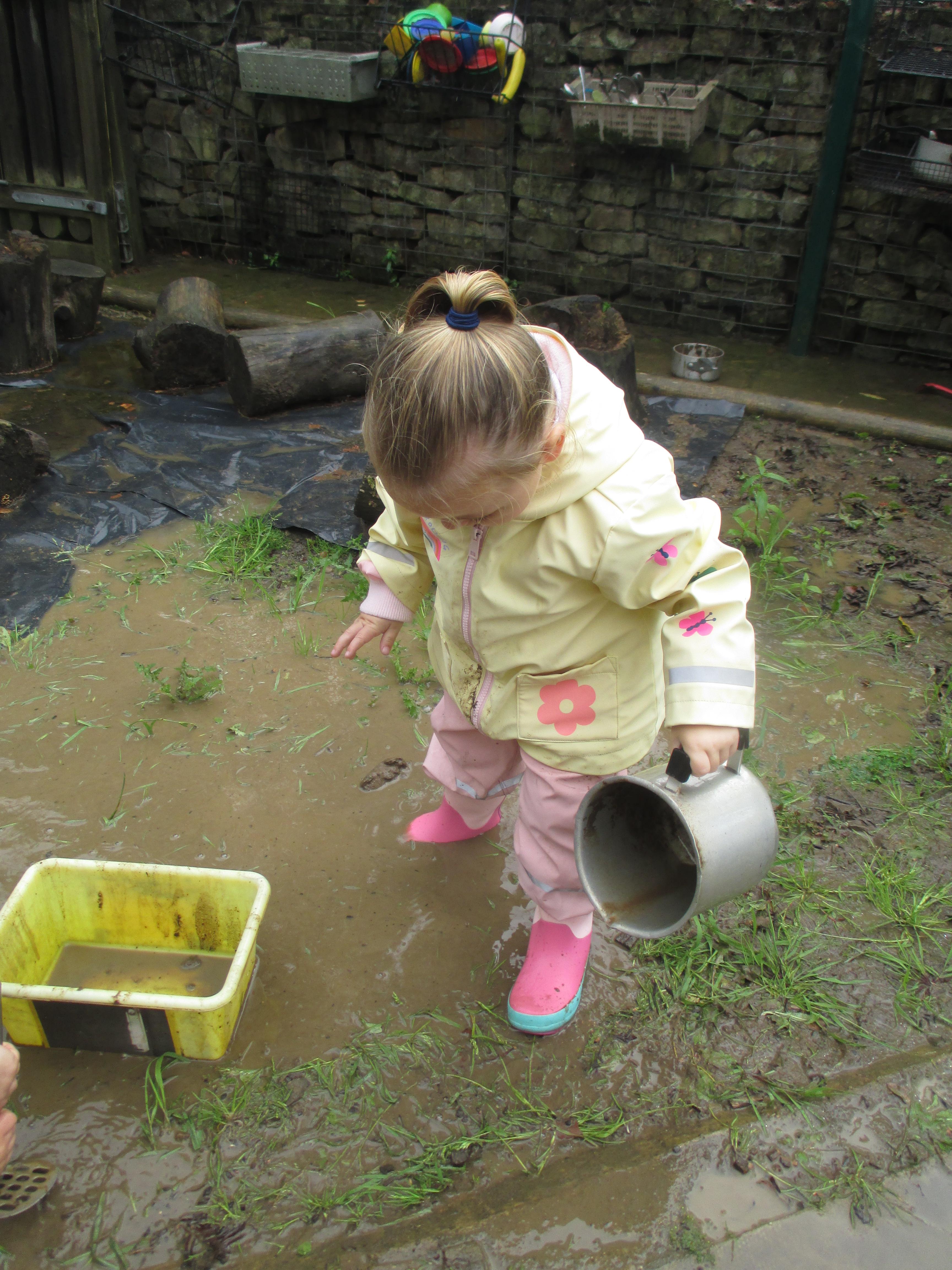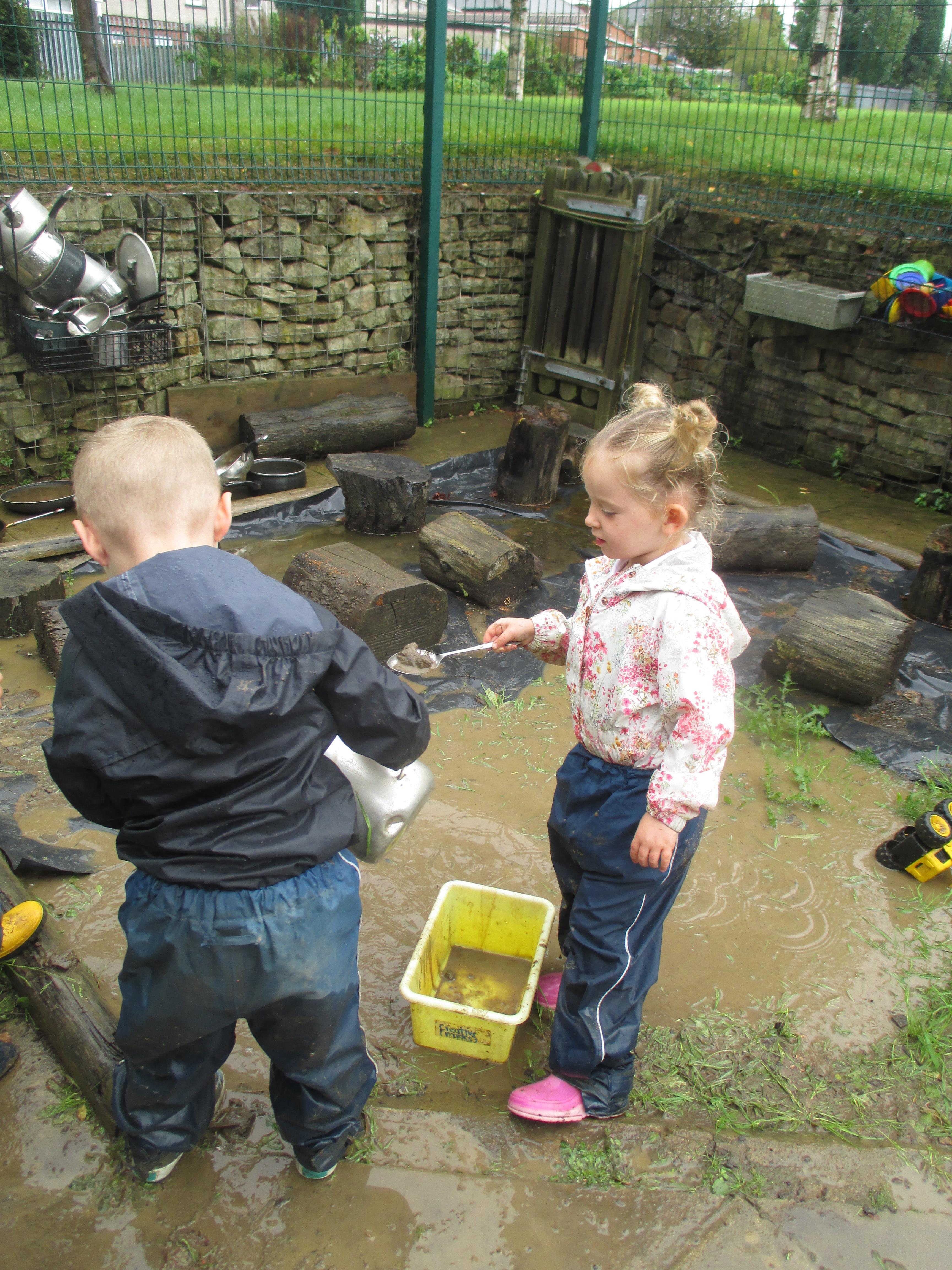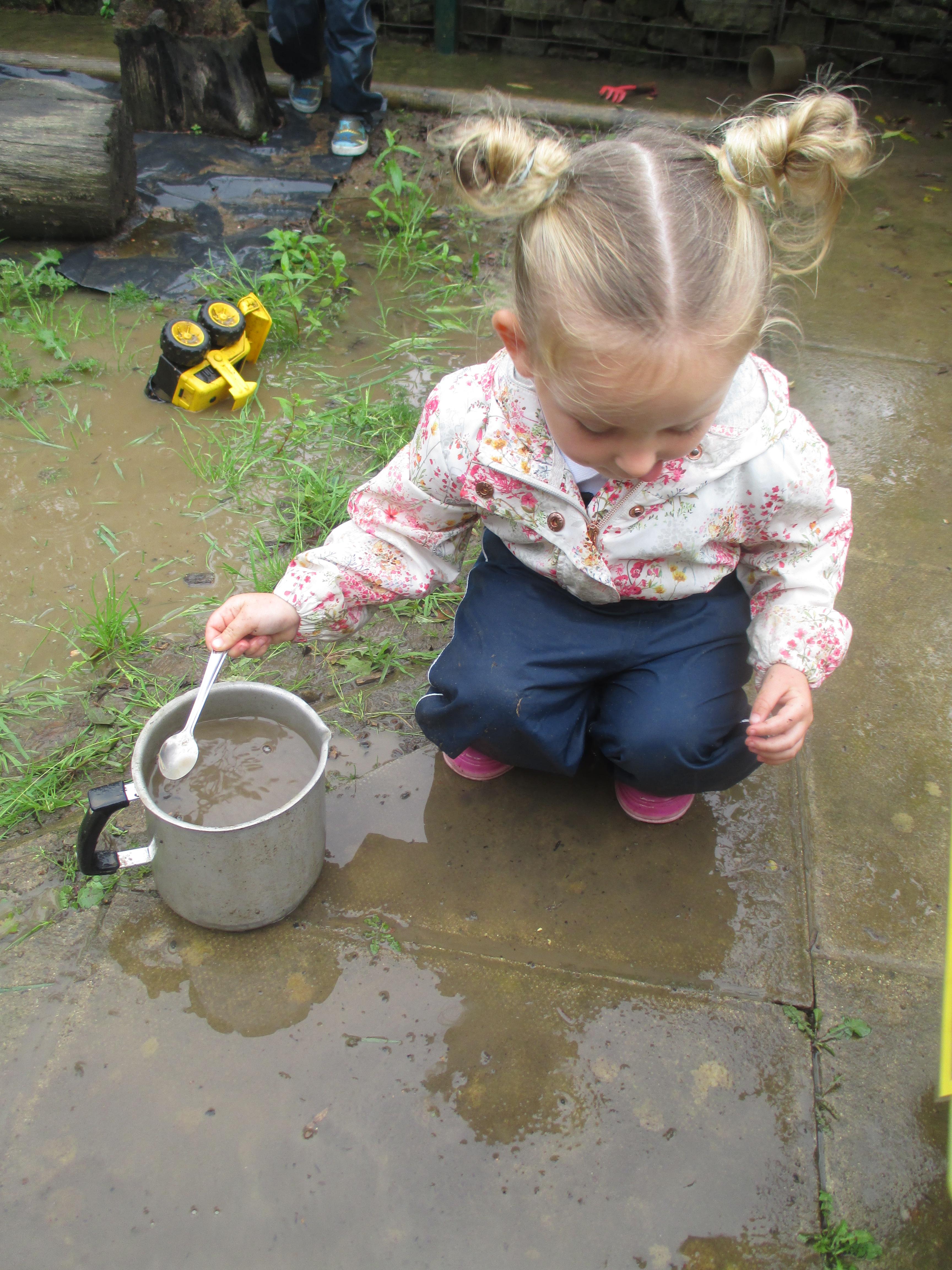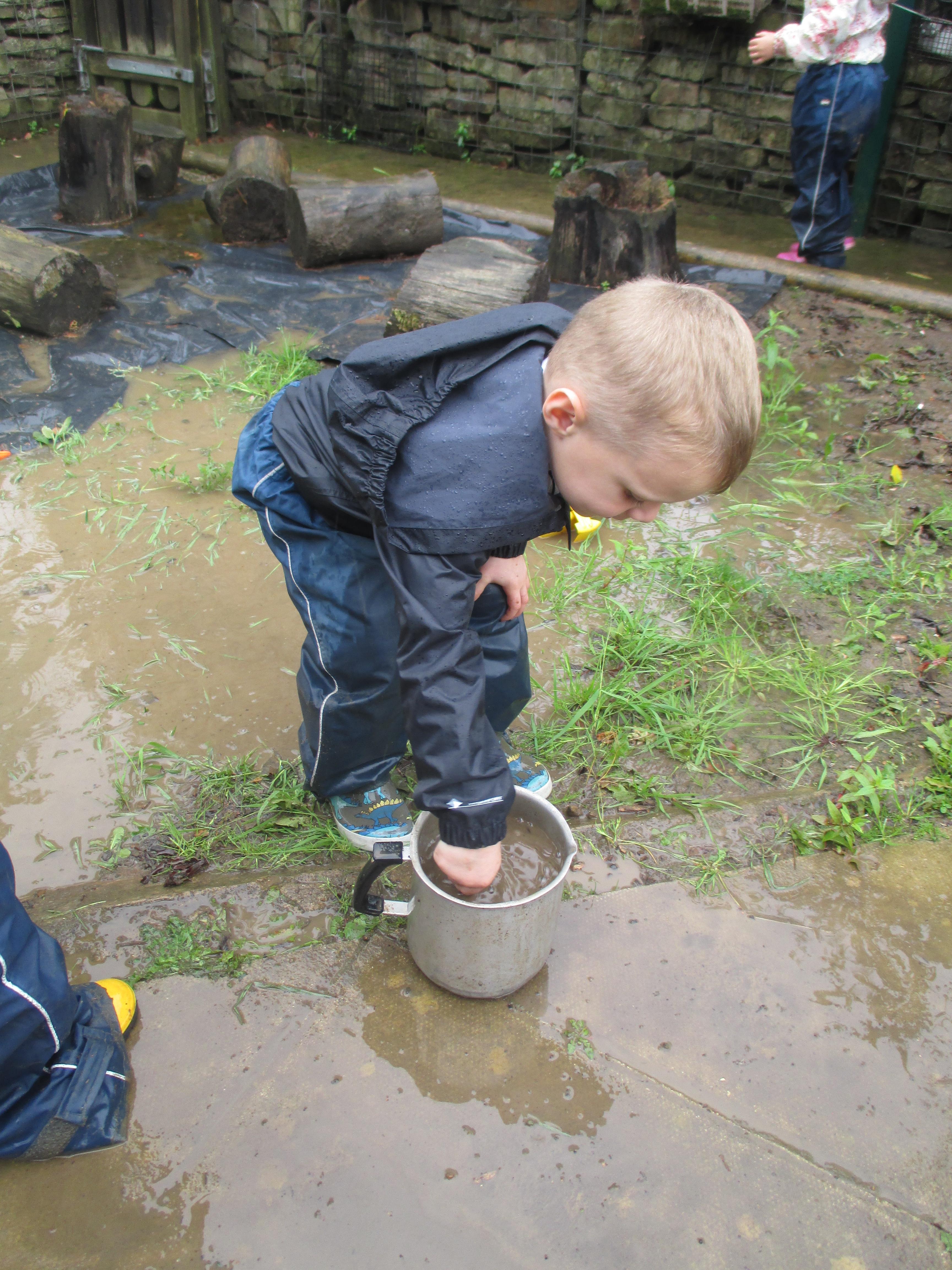 After some heavy rain, we noticed our mud kitchen was full of water. We decided to put our waterproofs on and go and explore. We enjoyed jumping in the puddles and filling the containers. We made mud soup and mud tea for our friends to drink. We threw in objects into the puddles to see if they would disappear and spoke about whether the water was deep or shallow. We had a lovely time and definitely needed a bath after.