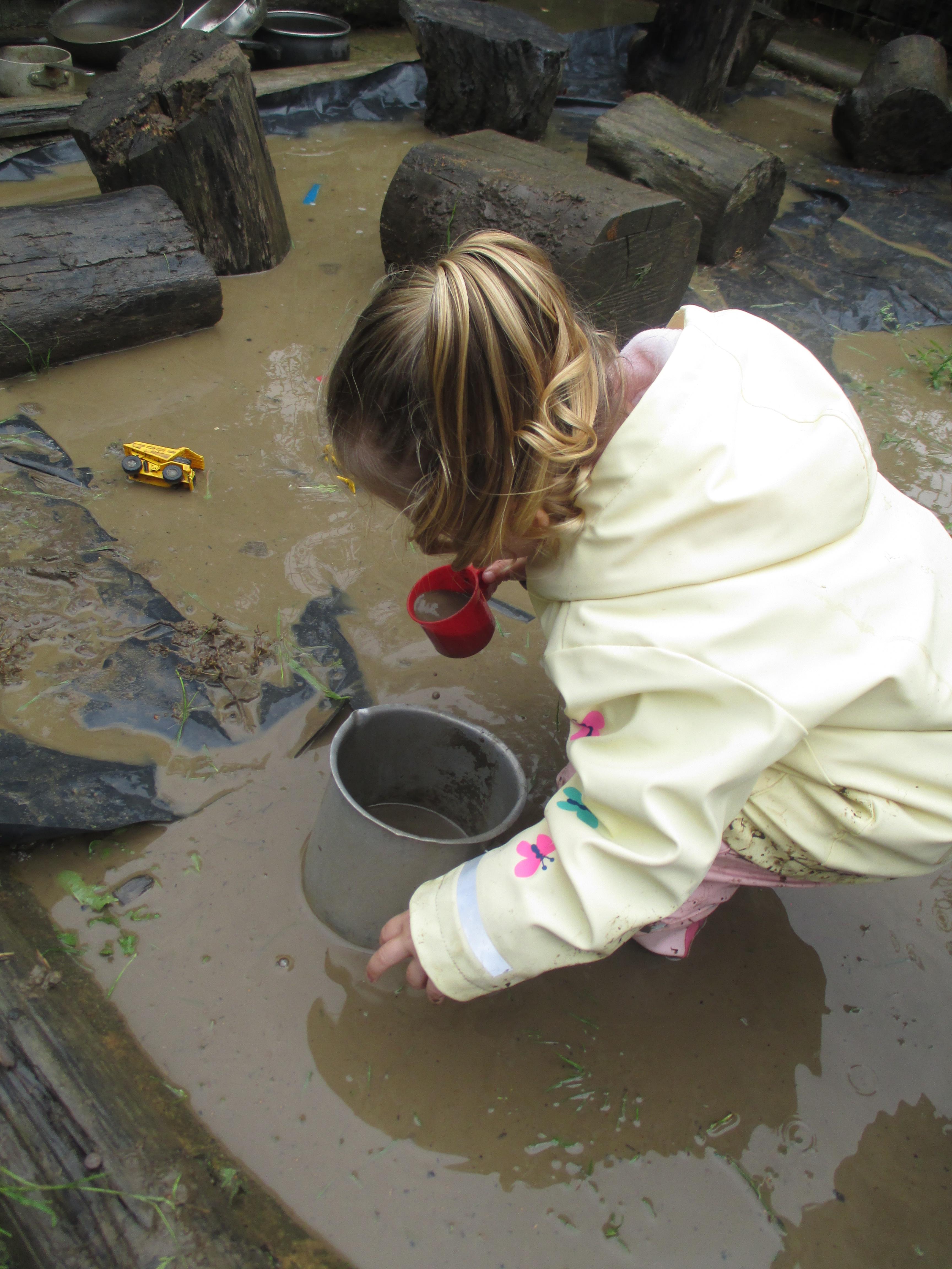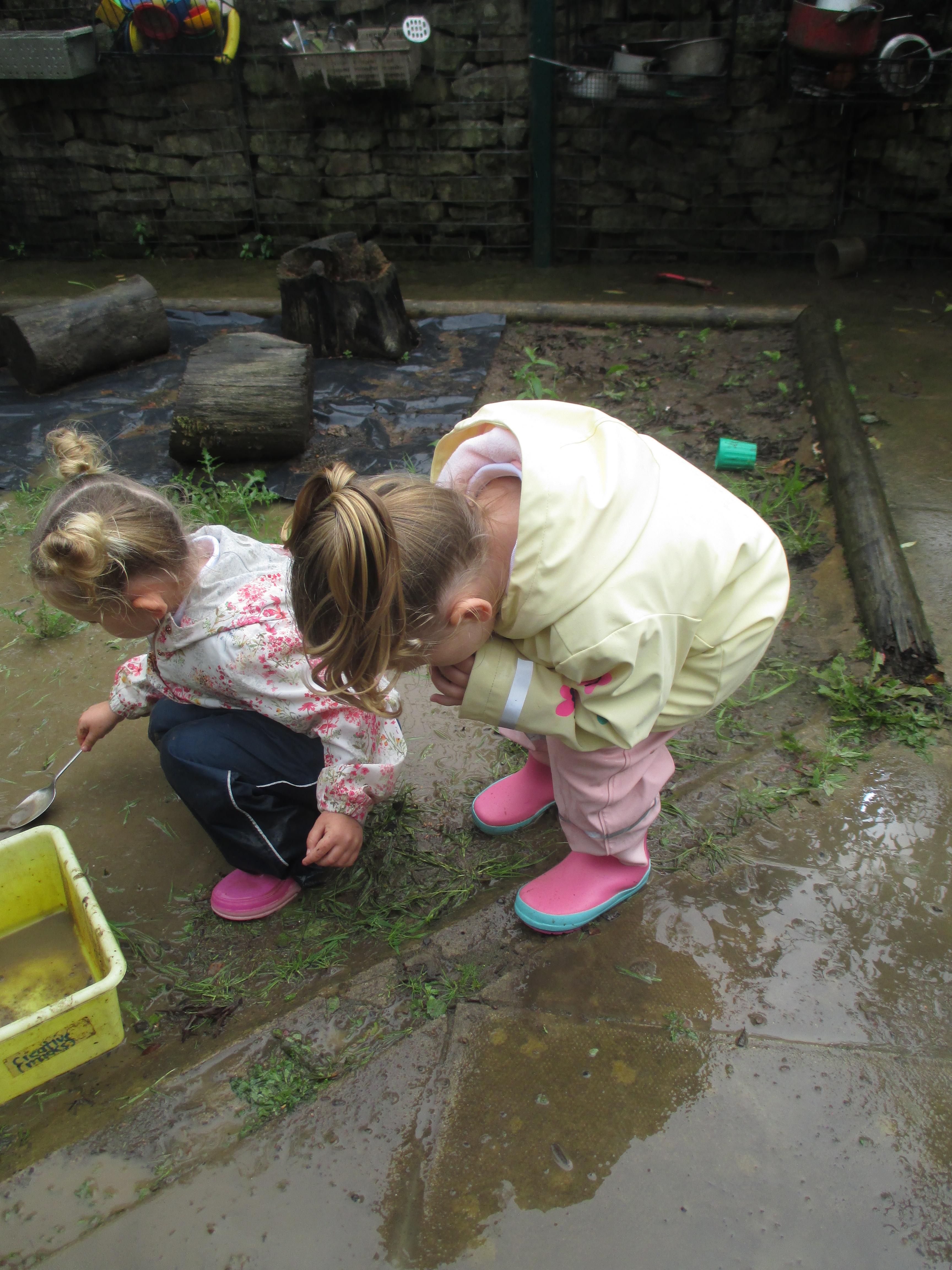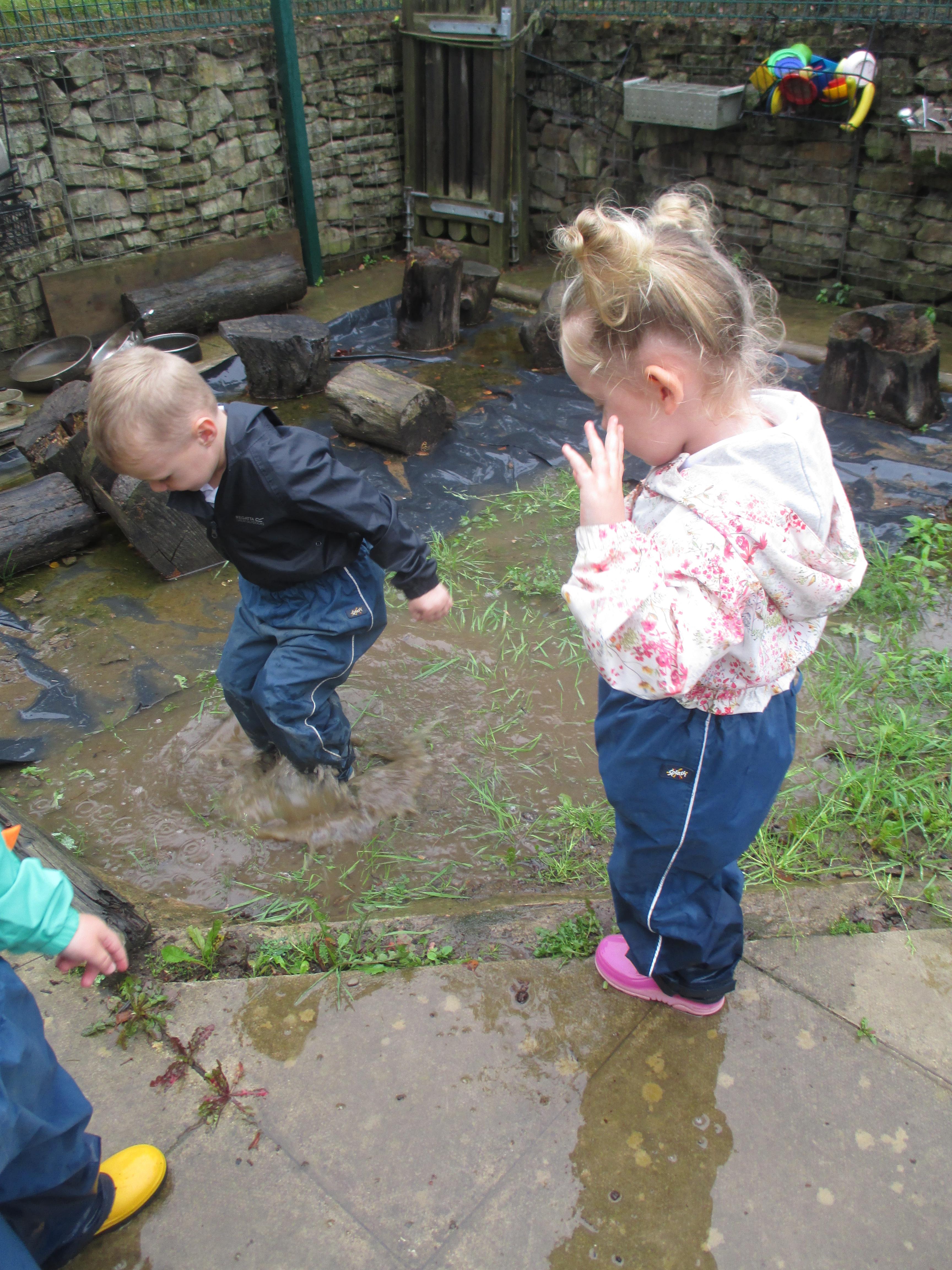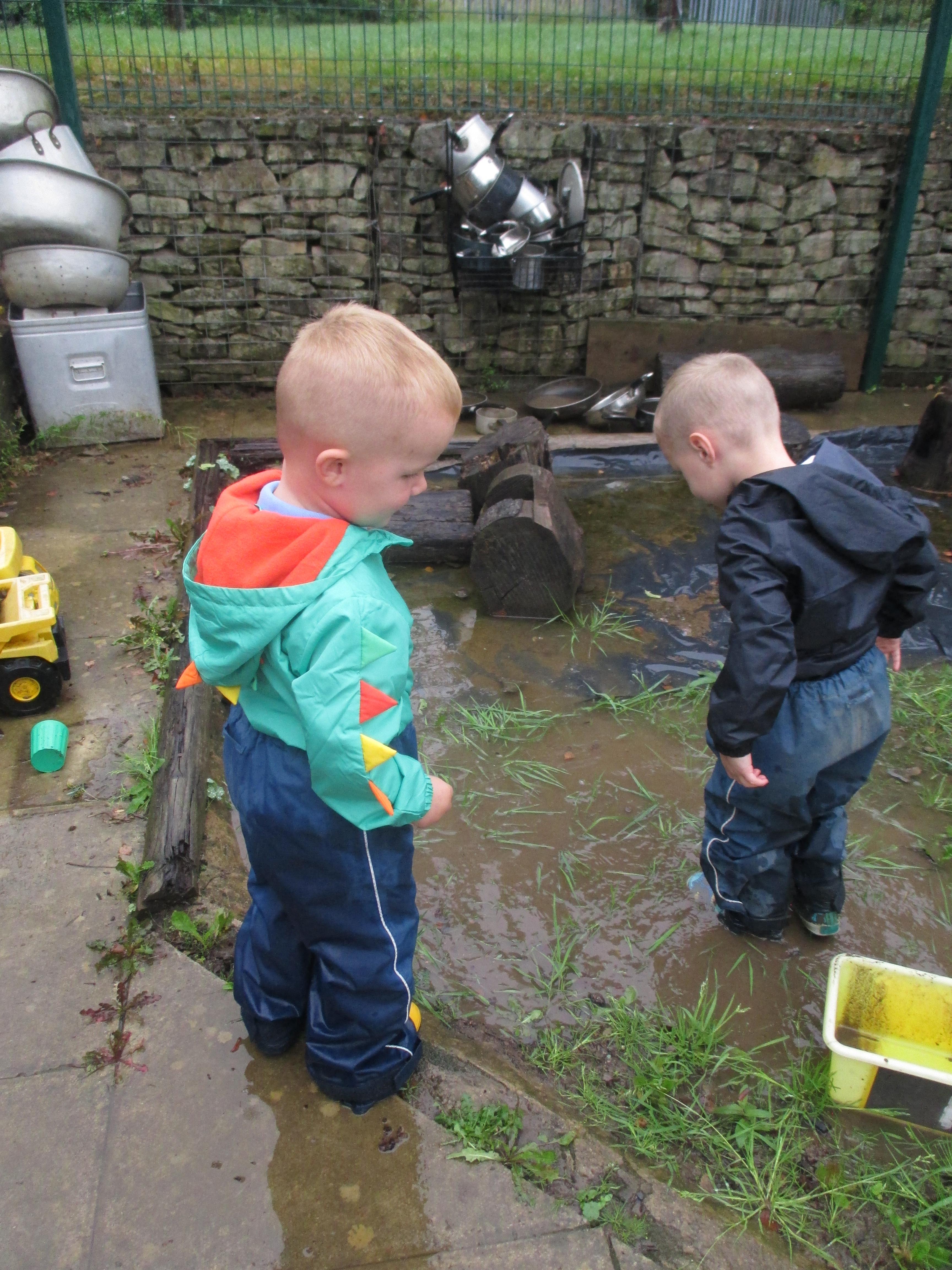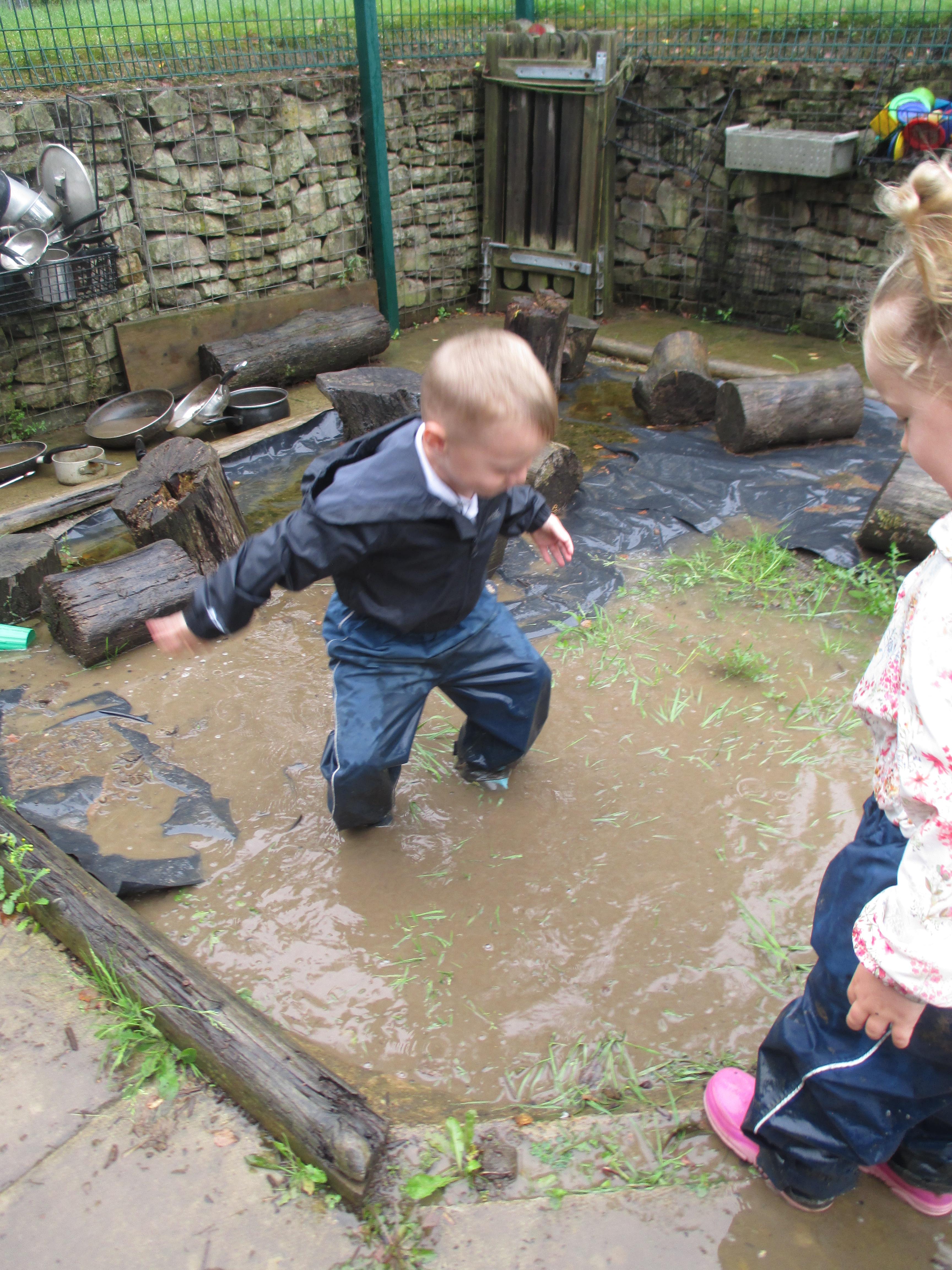 After some heavy rain, we noticed our mud kitchen was full of water. We decided to put our waterproofs on and go and explore. We enjoyed jumping in the puddles and filling the containers. We made mud soup and mud tea for our friends to drink. We threw in objects into the puddles to see if they would disappear and spoke about whether the water was deep or shallow. We had a lovely time and definitely needed a bath after.