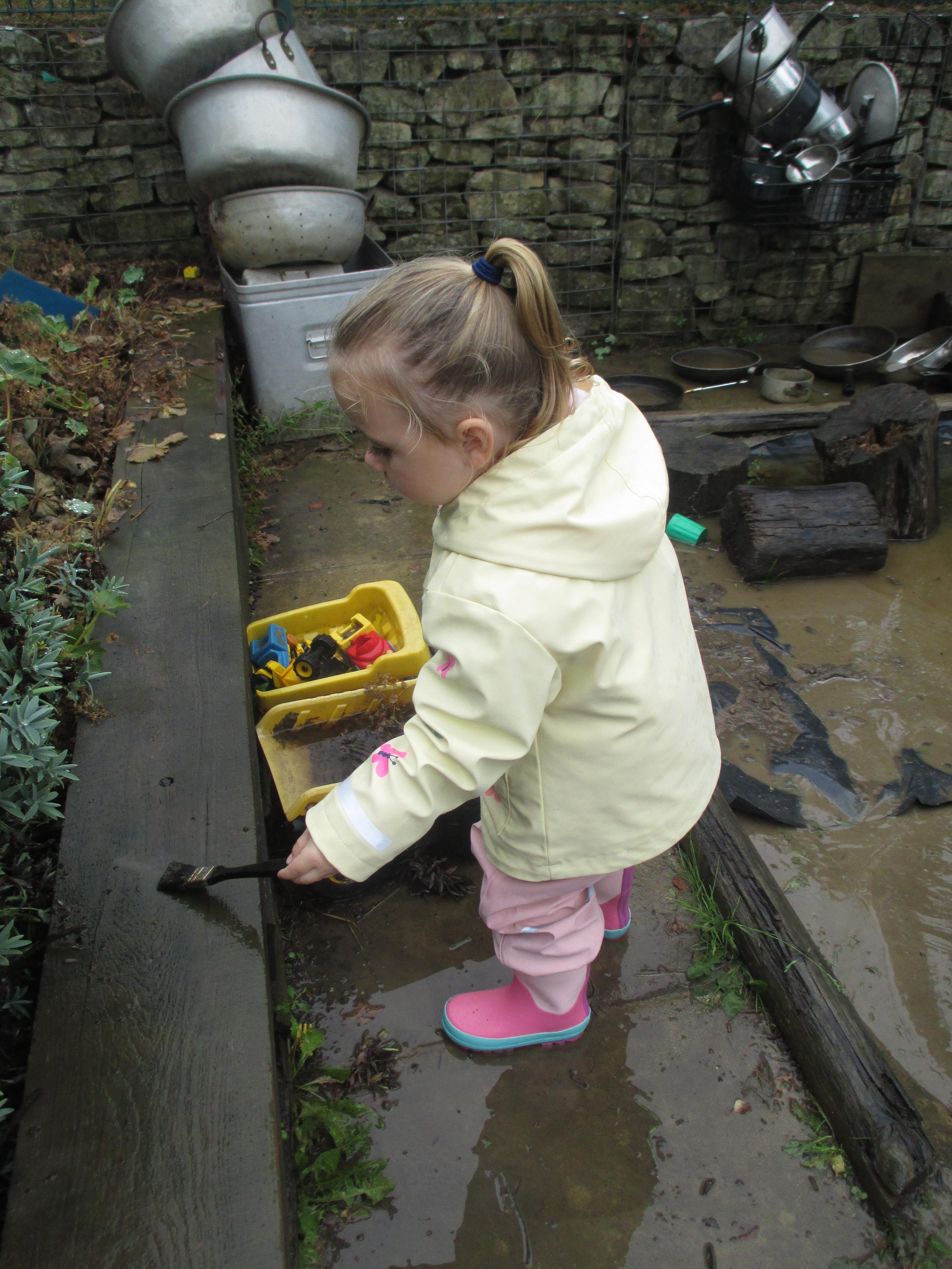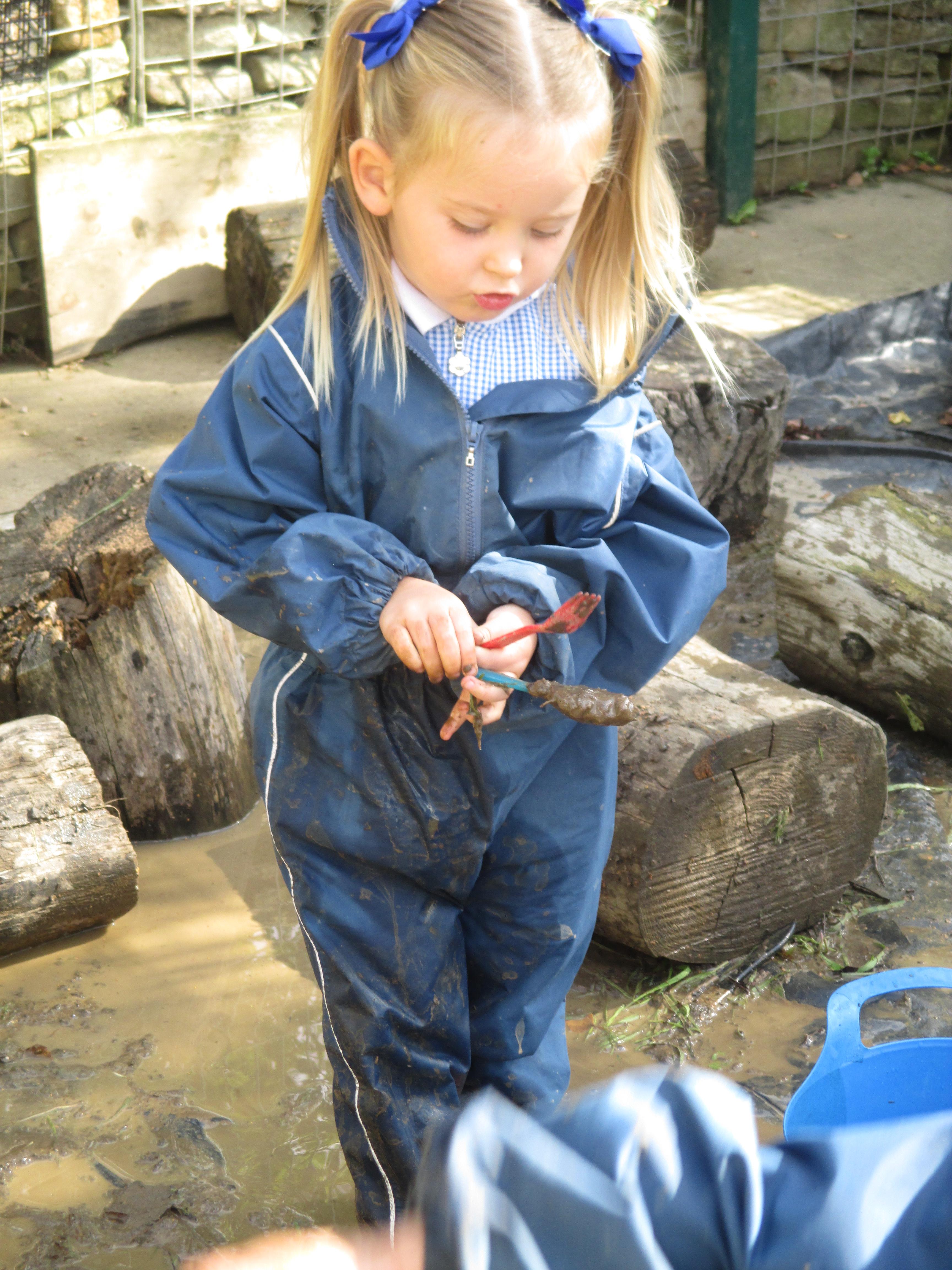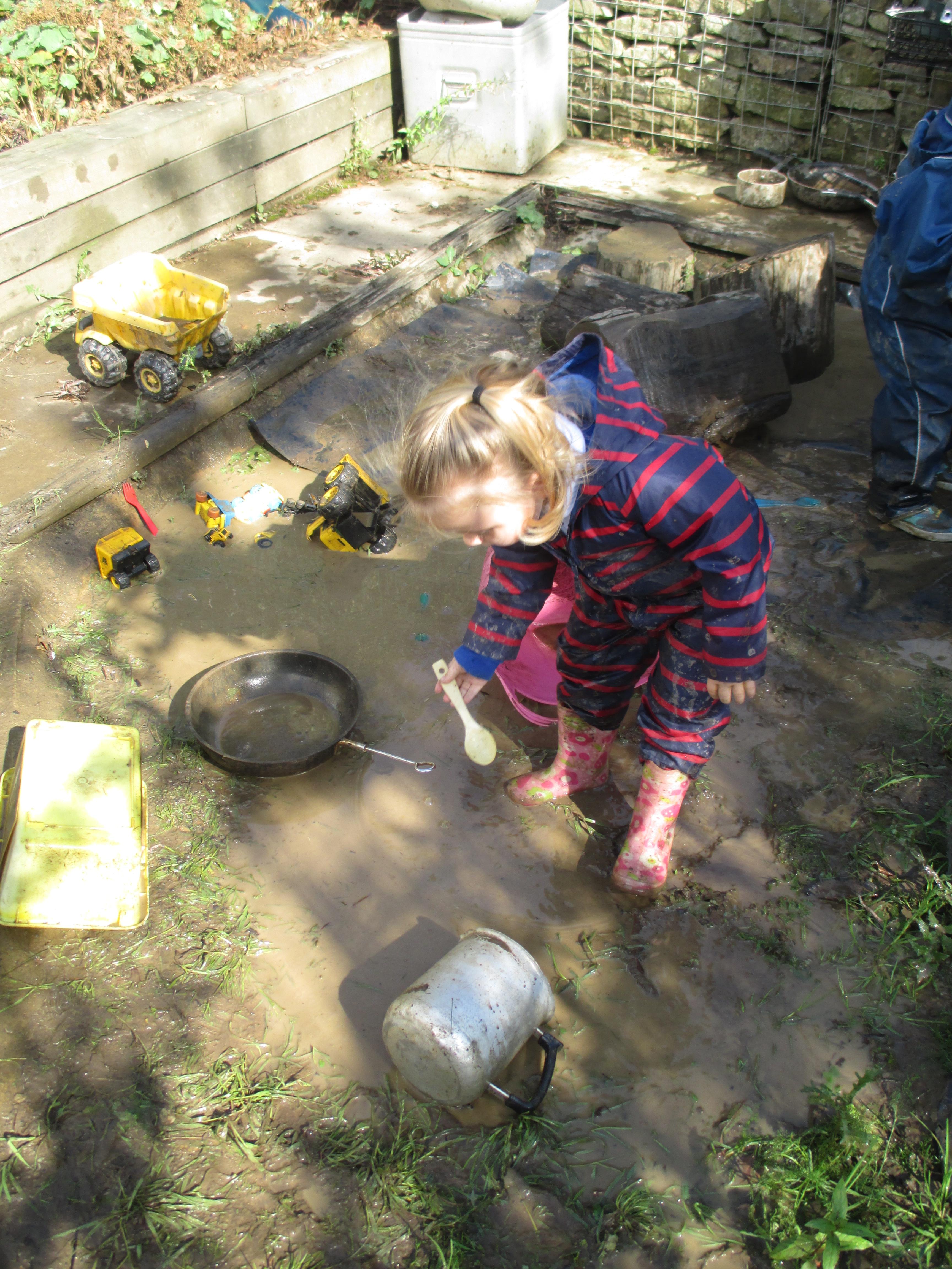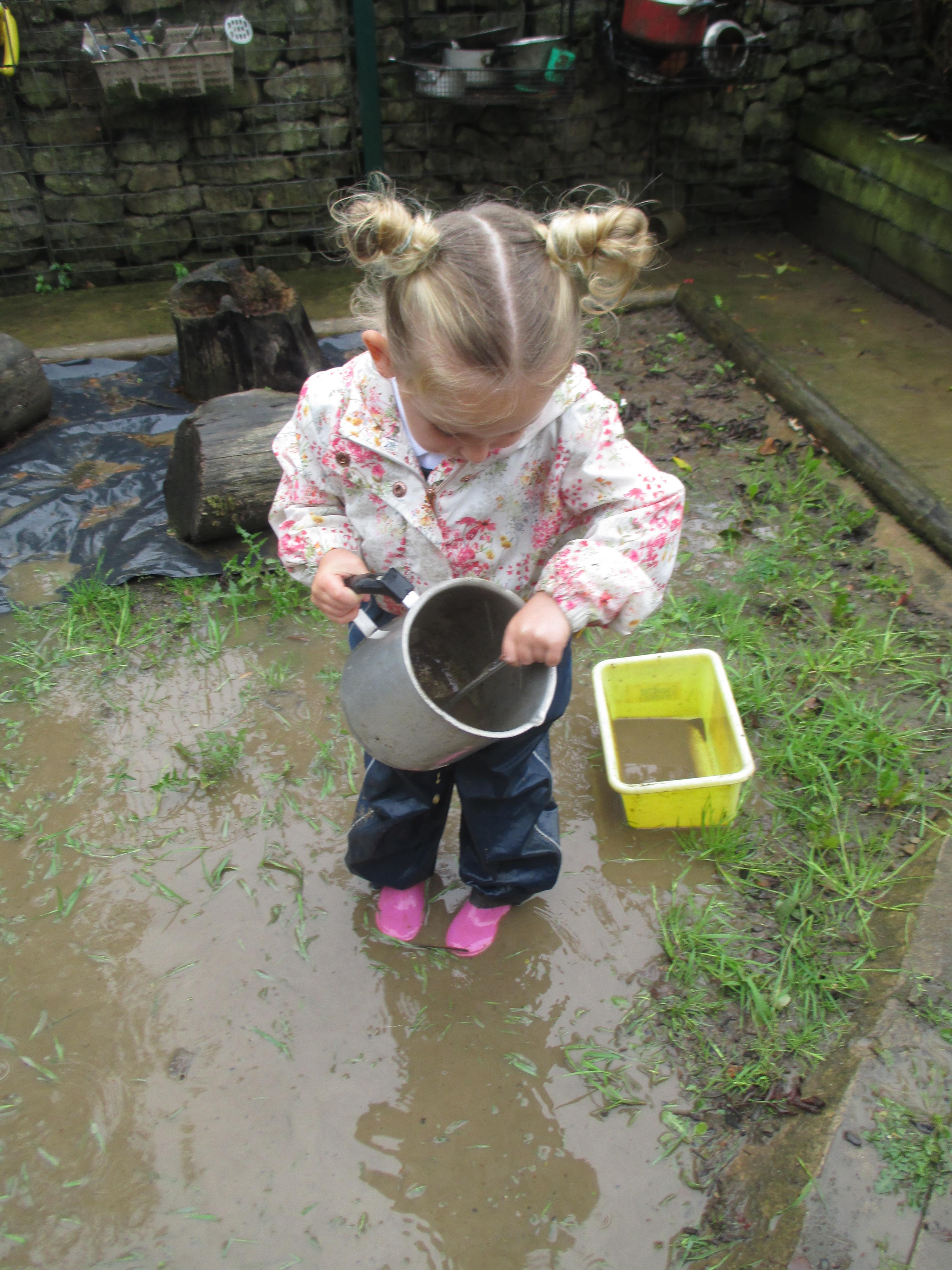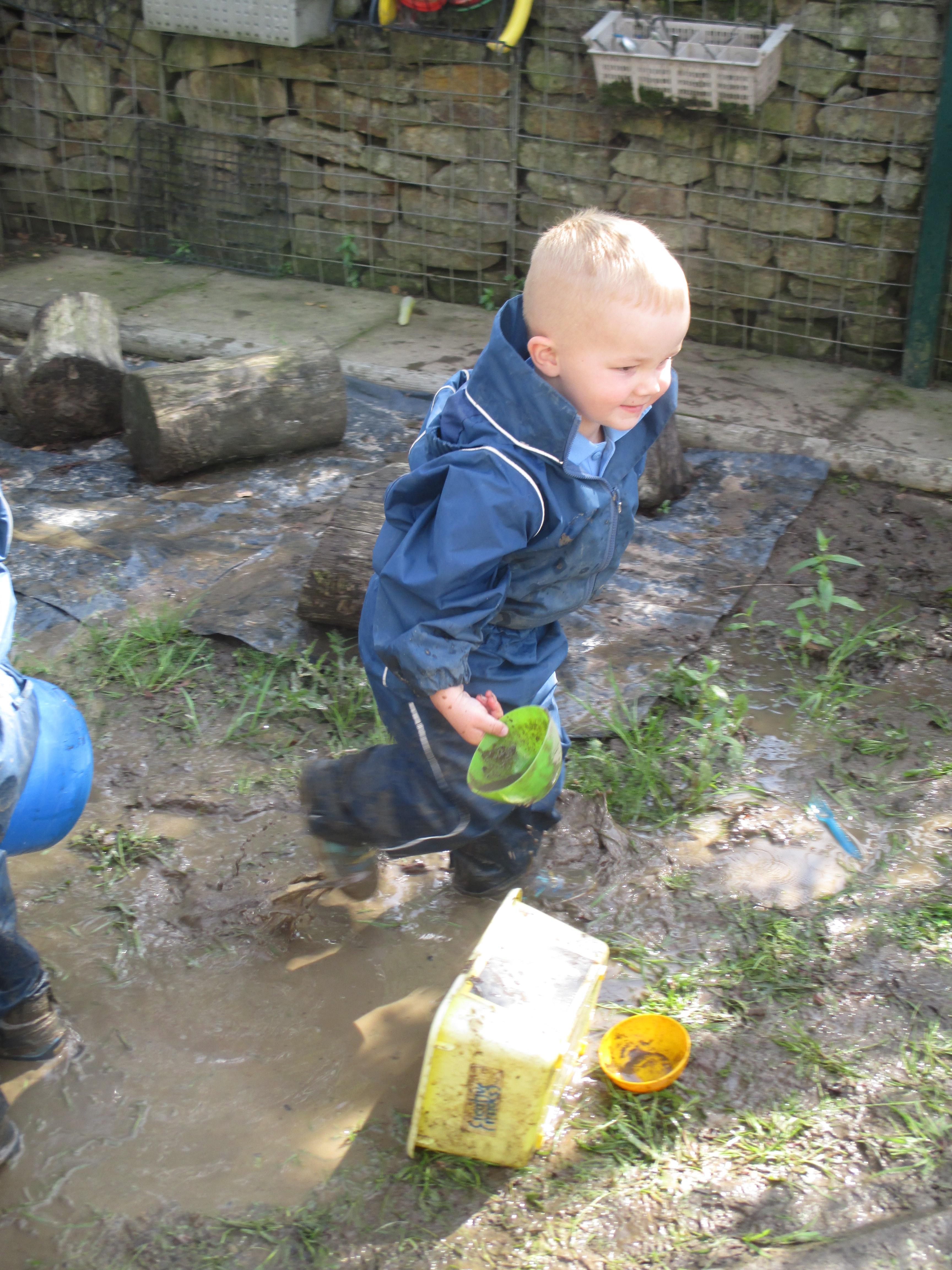 After some heavy rain, we noticed our mud kitchen was full of water. We decided to put our waterproofs on and go and explore. We enjoyed jumping in the puddles and filling the containers. We made mud soup and mud tea for our friends to drink. We threw in objects into the puddles to see if they would disappear and spoke about whether the water was deep or shallow. We had a lovely time and definitely needed a bath after.